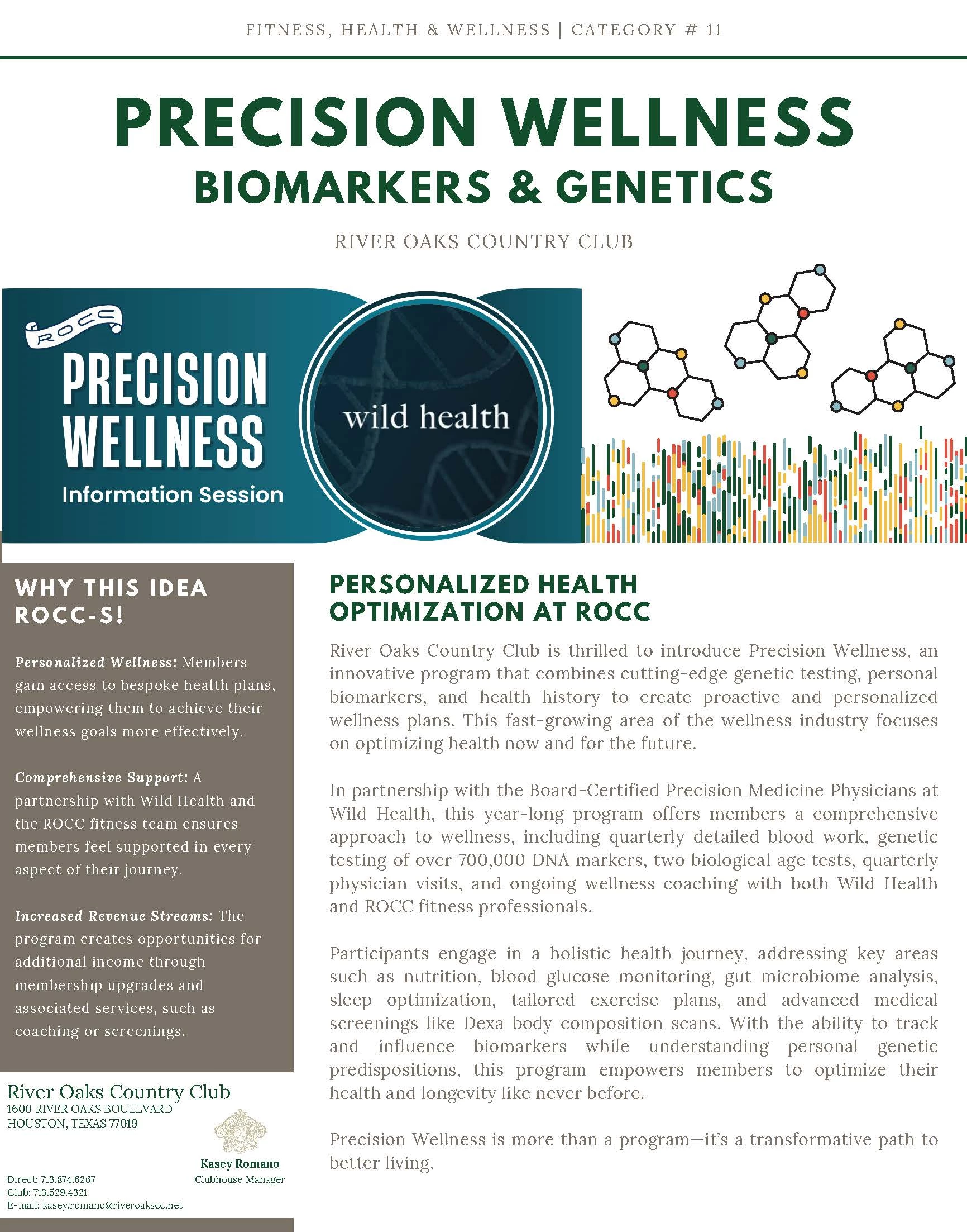 In partnership with the Board-Certified Precision Medicine Physicians at Wild Health, this year-long program offers members a comprehensive approach to wellness, including quarterly detailed blood work, genetic testing of over 700,000 DNA markers, two biological age tests, quarterly physician visits, and ongoing wellness coaching with both Wild Health and ROCC fitness professionals.