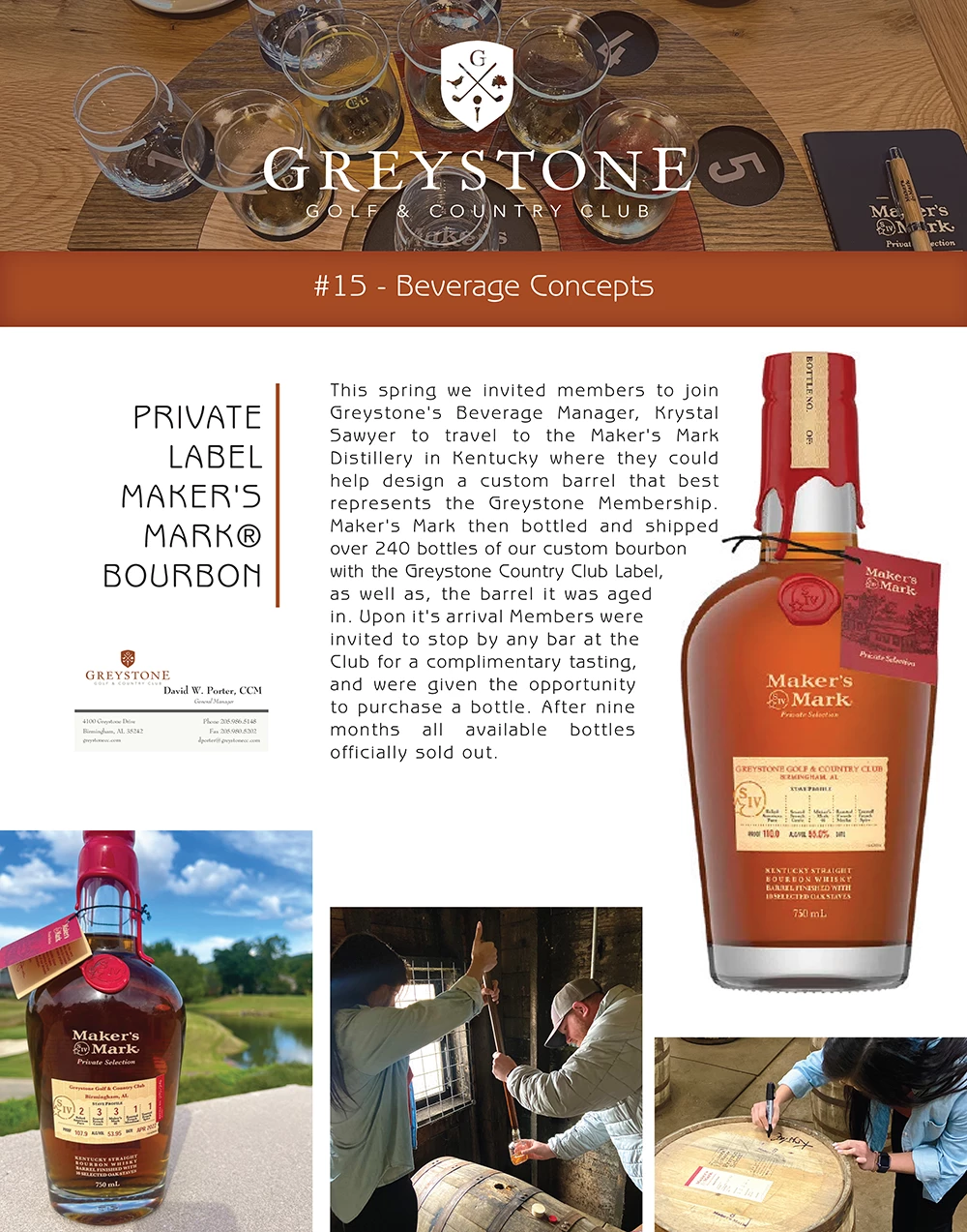 This spring, we invited members to join Greystone's Beverage Manager, Krystal Sawyer to travel to the Maker's Mark Distillery in Kentucky where they could help design a custom barrel that best represents the Greystone Membership. Maker's Mark then bottled and shipped over 240 bottles of our custom bourbon with the Greystone Country Club Label, as well as the barrel it was aged in.