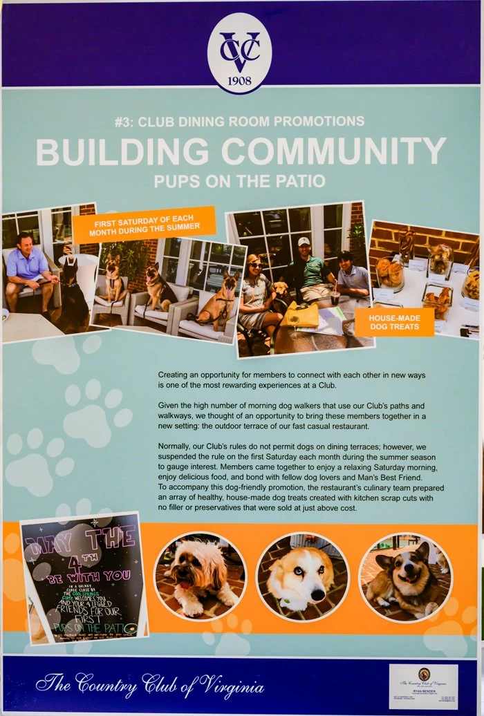 Normally, our Club’s rules do not permit dogs on dining terraces; however, we suspended the rule on the first Saturday each month during the summer season to gauge interest. To accompany this dog-friendly promotion, the restaurant’s culinary team prepared an array of healthy, house-made dog treats created with kitchen scrap cuts with no filler or preservatives that were sold at just above cost.