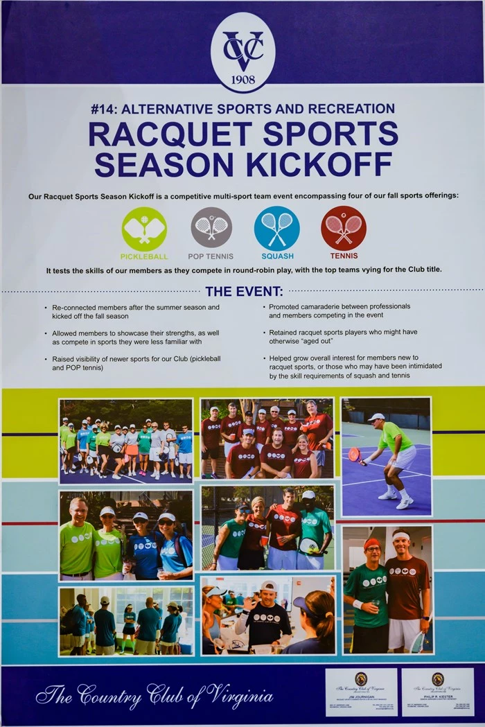 The event has provided an opportunity to both retain current racquet sports players who might have otherwise “aged out” of squash or tennis, and it has also helped to grow overall interest among those members who have never played a racquet sport and might otherwise be intimidated by the skills requirements of squash and tennis.