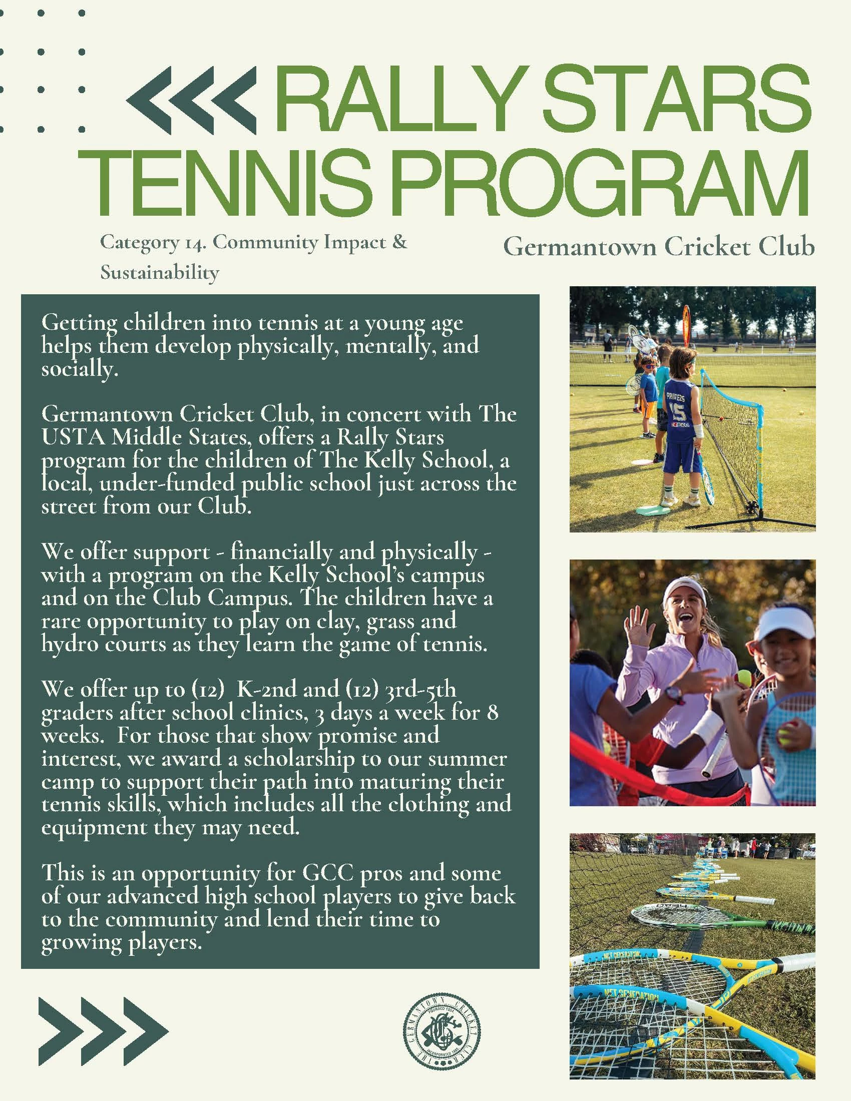 Rally Stars is an outreach program crafted to offer a low-income school an outlet to tennis facilities. While we offer support in other ways, this is a great program that offers after school care for many students, gives them physical activity and allows our members and staff to share their love for the game of tennis. Our members are proud to support the school and the children.