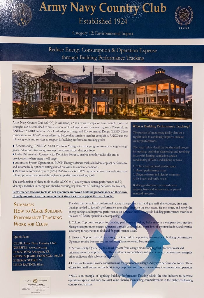 Army Navy Country Club (“ANCC”) in Arlington, VA incorporates multiple tools and strategies that combine to create a successful building performance tracking strategy. The result: an ENERGY STAR® score of 95, a Leadership in Energy and Environmental Design (LEED) Silver certification, and HVAC issues addressed before they turn into member complaints. The results have achieved measurable reduction in utility expenses and a managed protection program of the club's capital assets by working to obtain maximum useful life of its infrastructure equipment.