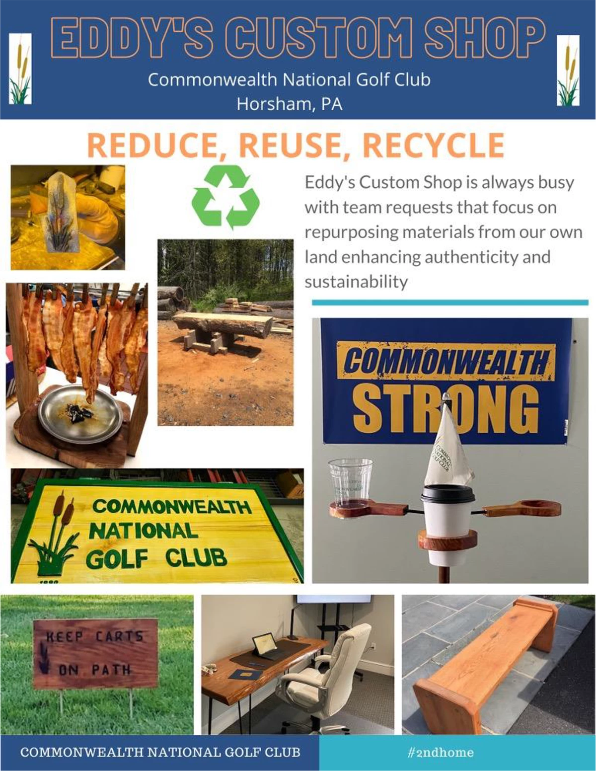 Repurposing an area of our maintenance department, "Eddy" has embraced every request with passion and creativity, often surpassing our expectations as well as members. Members love the unique authenticity and the recycling of our golf course trees, many they have a special relationship prior to removal. This year we will expand into club tournament and employee awards as well. Pride, integrity, and responsibility thrive here at Commonwealth.