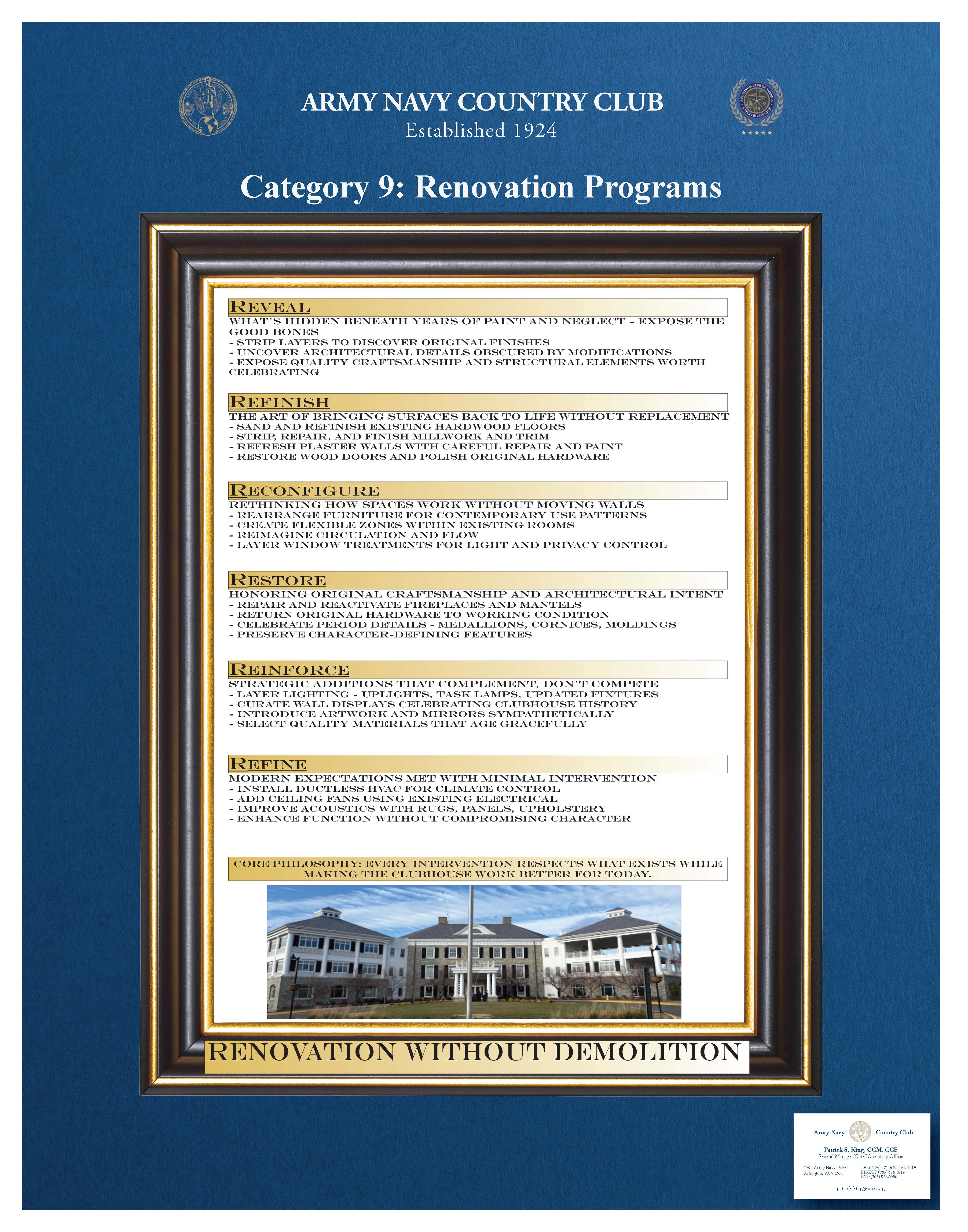 These focused renovations have been received very favorably by the membership. They are included in our regular annual work order system to ensure they are funded and scheduled each year. Not only does this approach create efficiencies within the club’s engineering department, but it ensures that the work is planned and is fully coordinated with other departments to avoid unanticipated interruptions to operations.