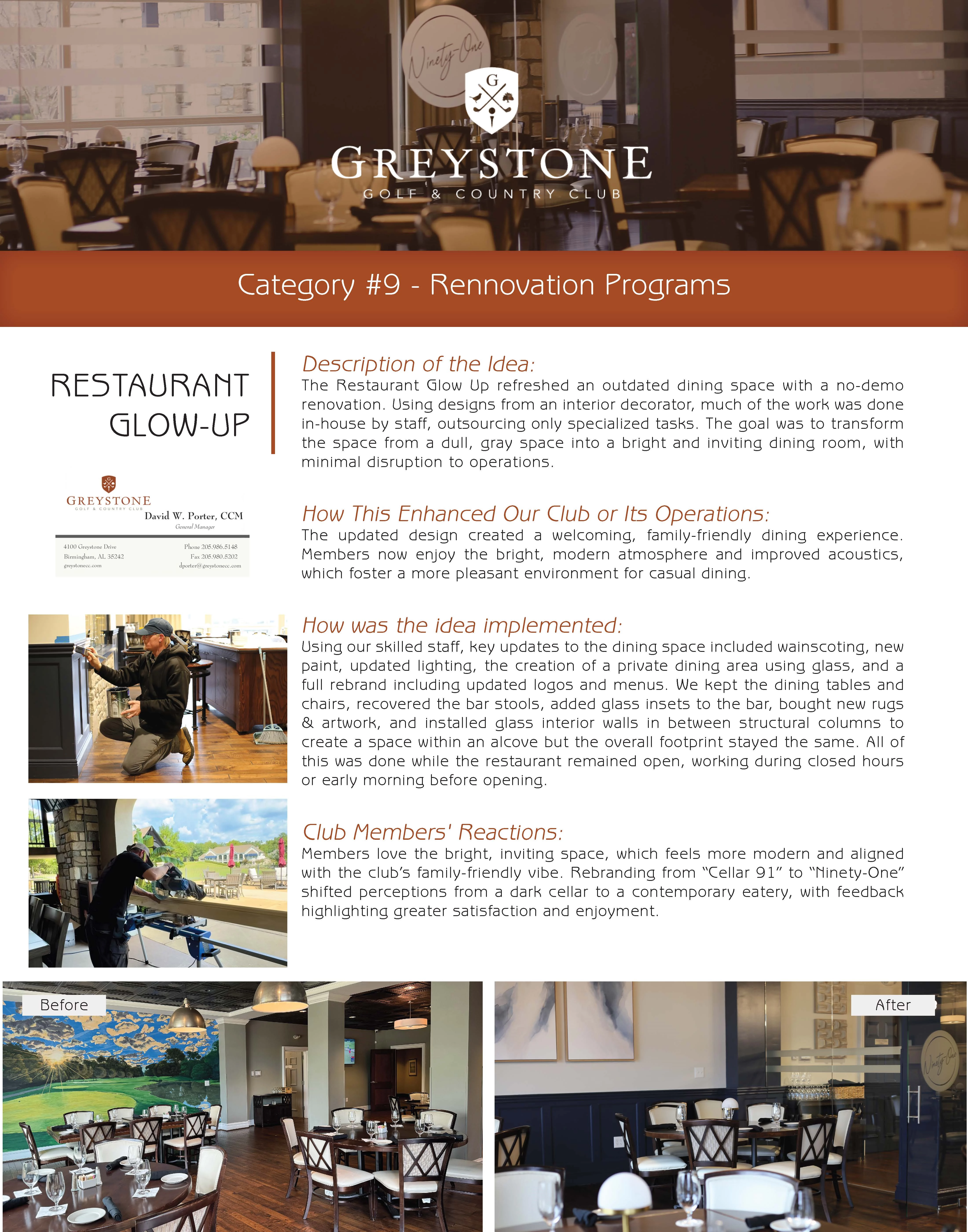 Using our skilled staff, key updates to the dining space included wainscoting, new paint, updated lighting, the creation of a private dining area using glass, and a full rebrand including updated logos and menus. We kept the dining tables and chairs, recovered the bar stools, added glass insets to the bar, bought new rugs & artwork, and installed glass interior walls in between structural columns to create a space within an alcove but the overall footprint stayed the same. All of this was done while the restaurant remained open, working during closed hours or early morning before opening. Members love the bright, inviting space, which feels more modern and aligned with the club’s family-friendly vibe. Rebranding from “Cellar 91” to “Ninety-One” shifted perceptions from a dark cellar to a contemporary eatery, with feedback highlighting greater satisfaction and enjoyment.