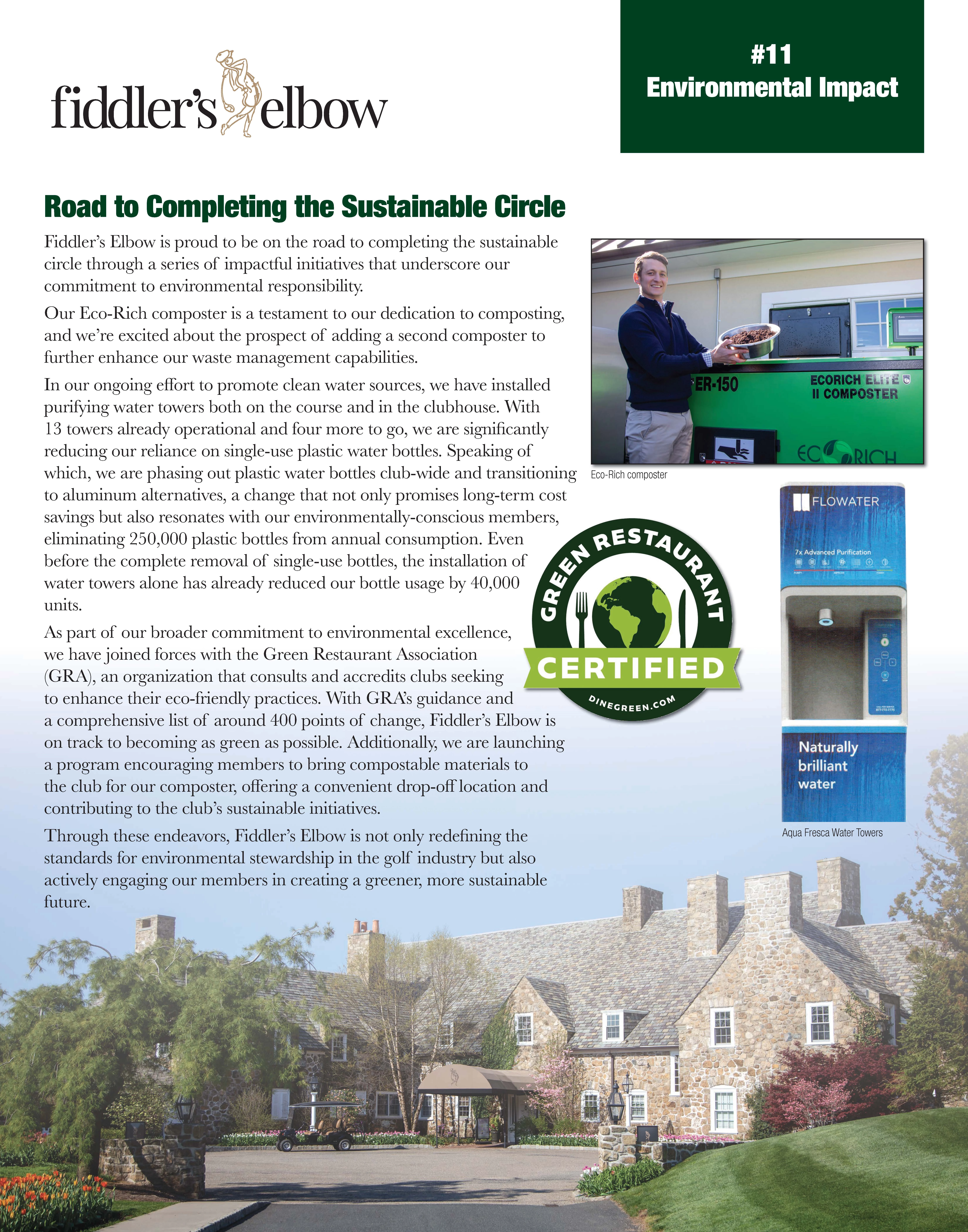 we have all heard "Farm to table" but Fiddler's Elbow has been completing the circle for many years now to "Table to Farm". from leasing a commercial composter to provide excellent waste management capabilities for our kitchens, to removing single use plastics clubwide, using the most environmentally stable plastic alternatives, LOLIWARE, and being accredited by the Green Restaurant Association, we have turned our operation from a traditional, wasteful club, to an environmentally focused, sustainable operation.