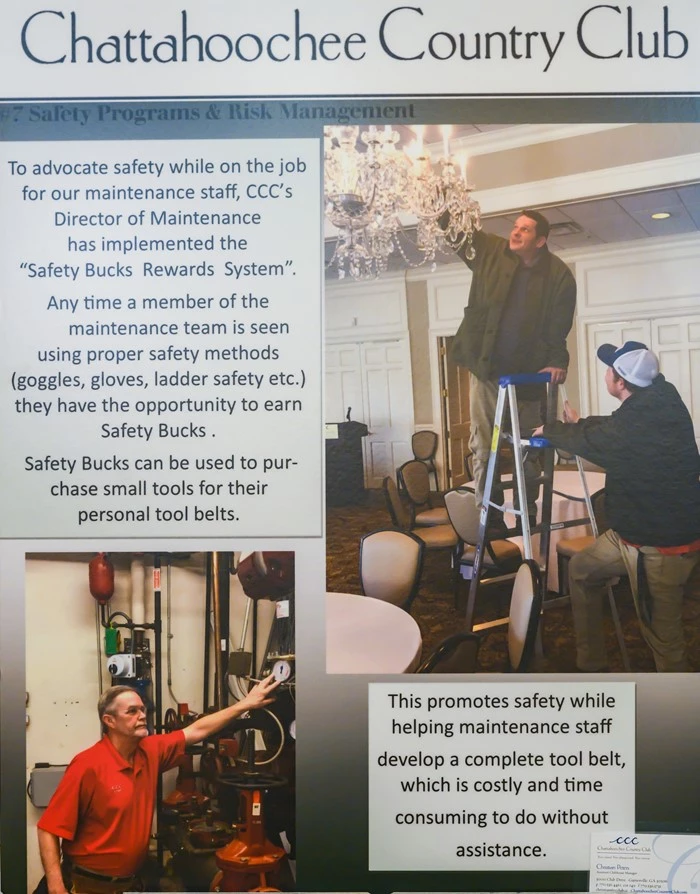 To promote safety while on the job for our maintenance staff, CCC implemented the “Safety Bucks System”. Any time one of the maintenance team is seen using safe practices (goggles, ladder safety) our Director of Maintenance awards a certain amount of Safety Bucks which can be used to purchase small tools for their personal tool belts. It helps keep safety in the forefront of our staffs minds.