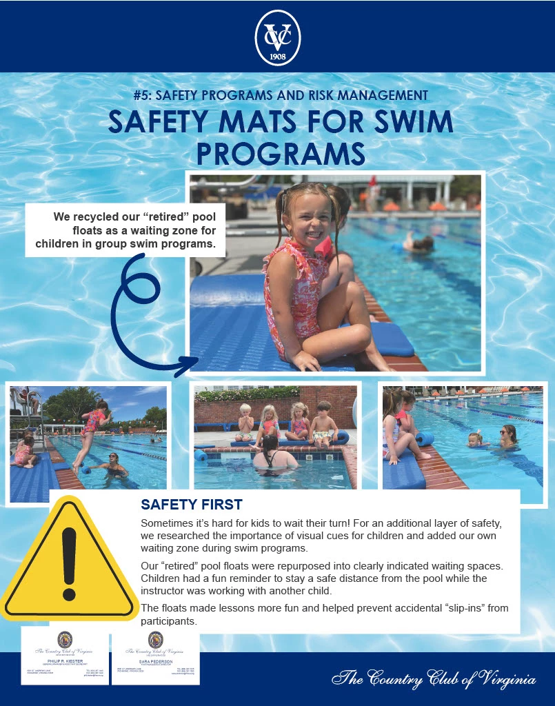 Safety is a top priority, especially in Aquatics. At The Country Club of Virginia, we host group swim lessons each summer for youth 3-8 years of age. We structure our group lessons to be at a ratio of 4 children to 1 swim instructor. The youngest participants tend to be non-swimmers, meaning they need assistance from an adult when in the pool. In years past, we had the participants sit on the brick coping edge of the pool to wait their turn with the instructor. We learned that brick coping gets slippery when wet. This means that the brick was a safety hazard for our participants. Over-eager non-swimmers could easily slip into the pool while waiting their turn, so the Aquatics Department needed a plan to keep participants safe.