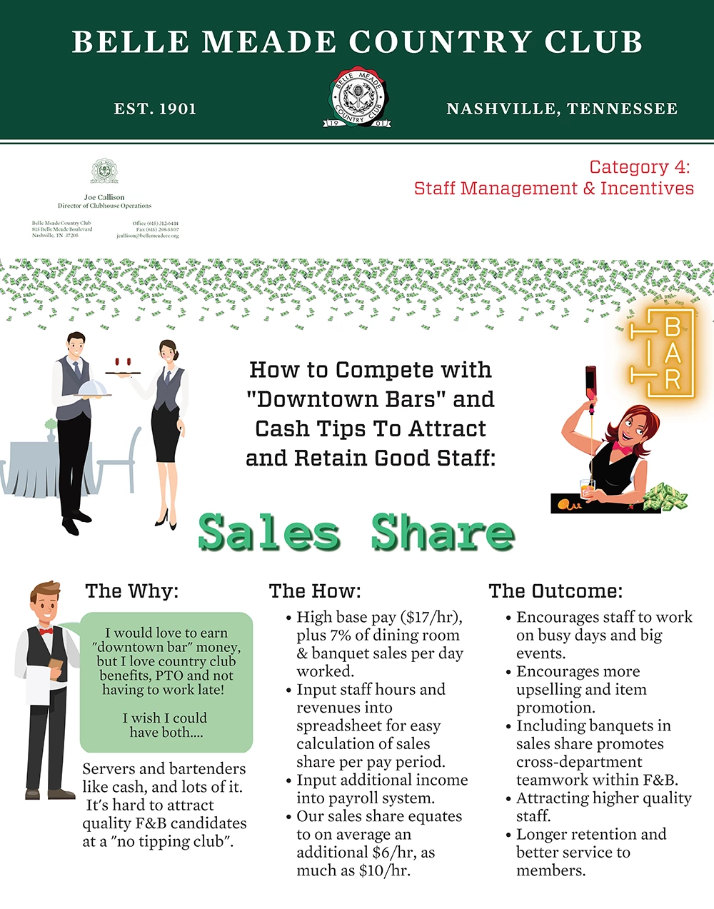 Sales Share gave us the opportunity to stop having to stress about staffing for significant club events, major weddings, and dinners on Fridays and Saturdays. The staff also learned more about the menu, worked more as a team, and, just as importantly, we hired and retained better staff. The membership is just starting to see the effects of Sales Share, but the comments and happiness of the members in food and beverage have been palpable.