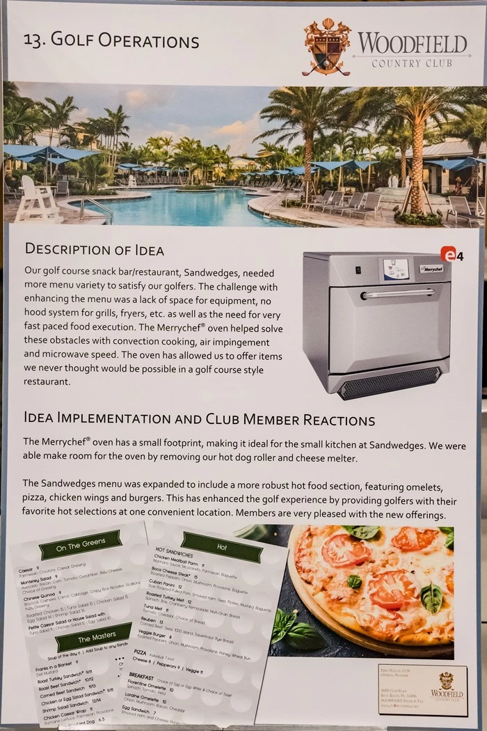 Our golf course snack bar/restaurant, Sandwedges, needed more menu variety to satisfy our golfers. The challenge with enhancing the menu was a lack of space for equipment, no hood system for grills, fryers, etc. as well as the need for very fast paced food execution. The Merrychef® oven helped solve these obstacles with convection cooking, air impingement and microwave speed. The oven has allowed us to offer items we never thought would be possible in a golf course style restaurant.