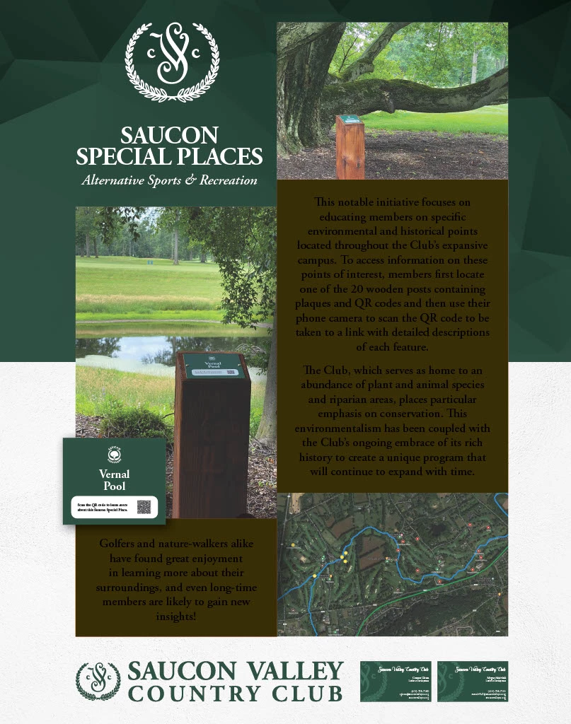 This notable initiative focuses on educating members on specific environmental and historical points located throughout the Club’s expansive campus. To access information on these points of interest, members first locate one of the 20 wooden posts containing plaques and QR codes and then use their phone camera to scan the QR code to be taken to a link with detailed descriptions of each feature.