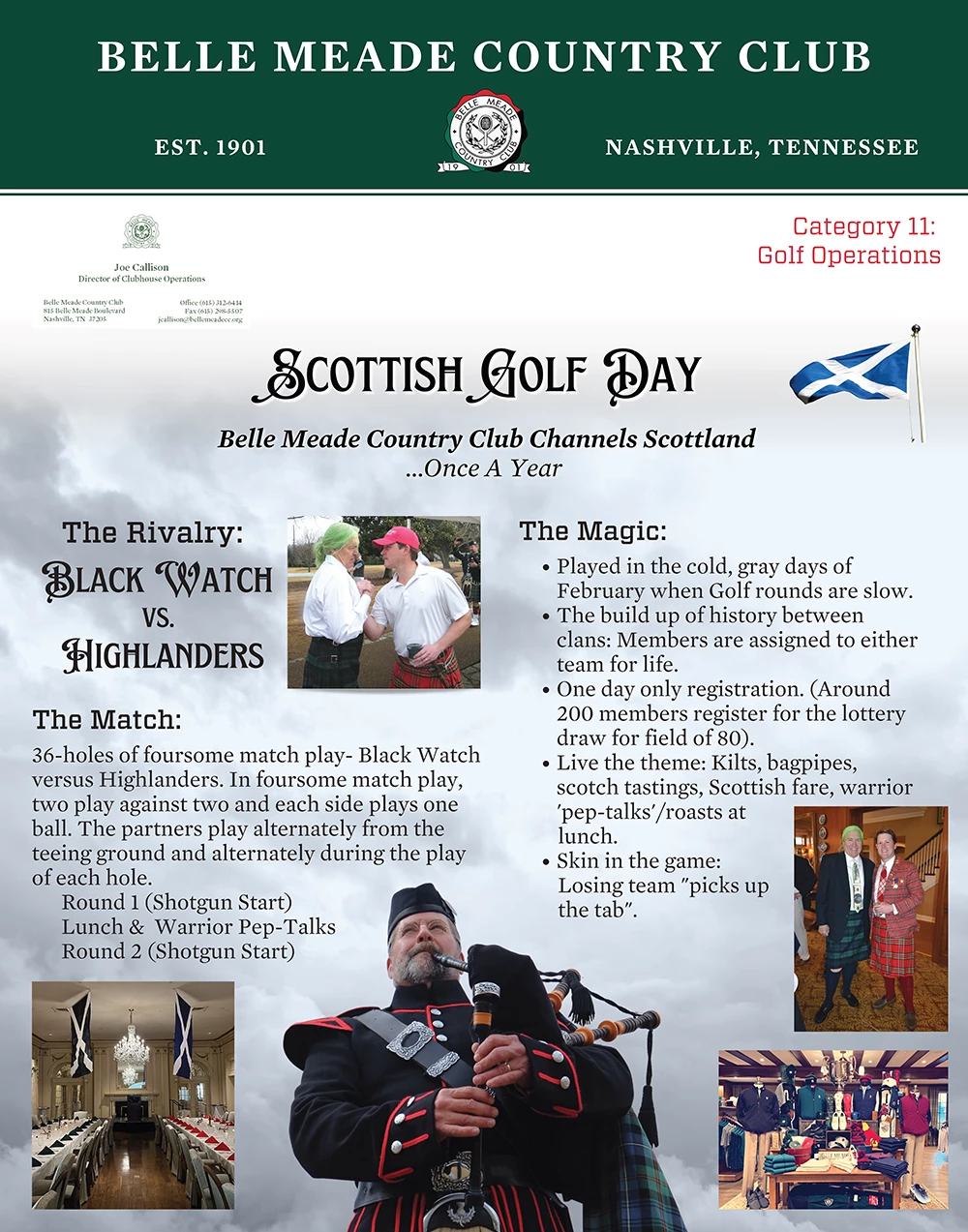 Scottish Golf Day kicks off our golf season in the cold, gray, late days of winter when golf rounds are otherwise slow. Beginning in February 2008, the men of Belle Meade, Tennessee have channeled their inner Scotsmen, embracing the history and continuing the fight of the Highlanders of Scotland, who wanted emancipation from George I of England, and the army of the Black Watch, who were employed to protect England and its empire. Nearly 200 men register for the Scottish Golf Day lottery, for which 80 spaces are available. A lottery draw is held in the Men’s Locker Room following registration. A Kick-off Party is held in the Men’s Locker Room the Friday night before the big battle. Saturday morning, 36-holes of foursome match play: Black Watch versus Highlanders. In foursome match play, two play against two and each side plays one ball. The partners play alternately from the teeing ground and alternately during the play of each hole. There are a few exemptions from the lottery being: Team Captains and Assistant Captains, Previous Captain from each team, Club President and Green Committee Chairman. In addition, each Captain is allowed three Captain’s Picks.
