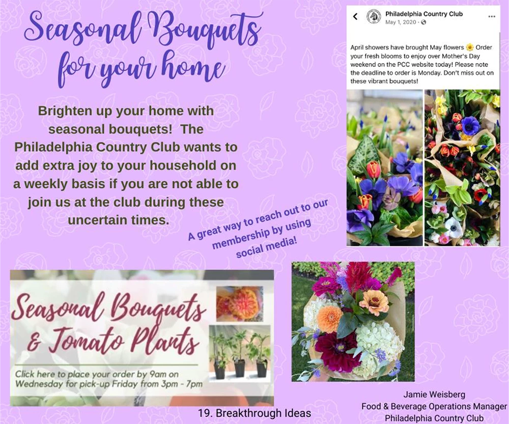 The Philadelphia Country Club offered seasonal bouquets to be ordered weekly by the membership starting in the Spring. The membership was quickly engaged and excited about this weekly option. While offering take-out dining, members would also pick up their bouquets to enjoy at home during the uncertain times. By offering this option it gave our membership something to look forward to weekly and a majority of our membership ordered dinner for take-out while stopping at the club.