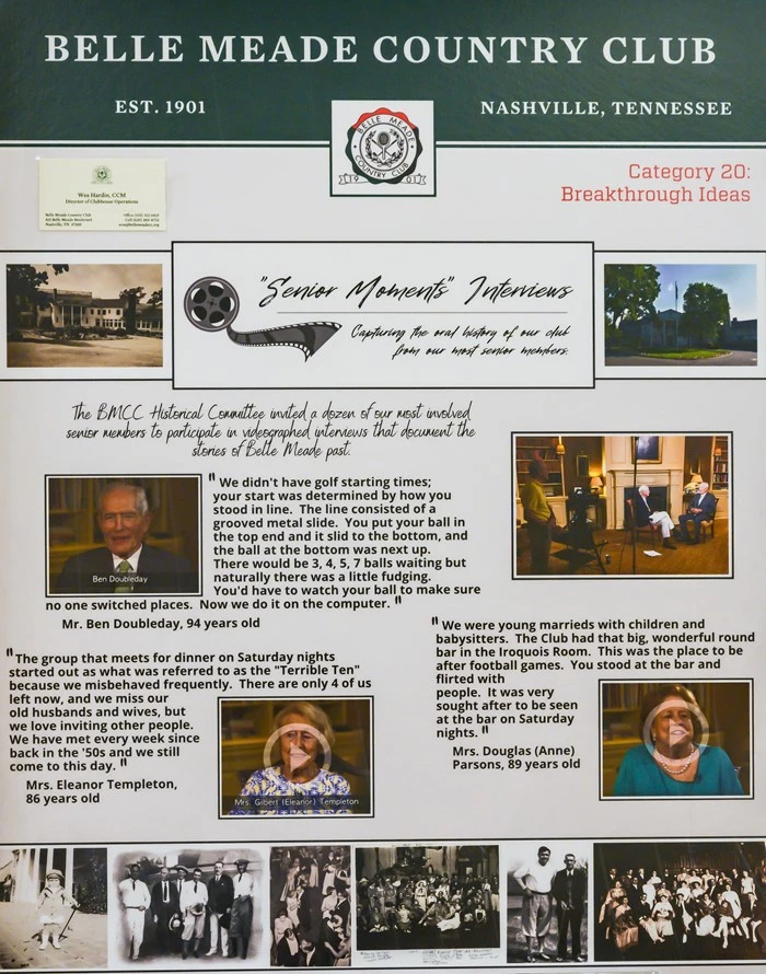 The Historical Committee at Belle Meade Country Club is continuously looking for new ways to preserve our history. This usually has means compiling, cataloging and storing it's written history in the form of documents, pictures, menu's, etc. BMCC is now preserving its oral history by interviewing our most graceful Senior Members about the history of the club and preserving their statements for years to come. We call the process "Senior Moment Interviews".
