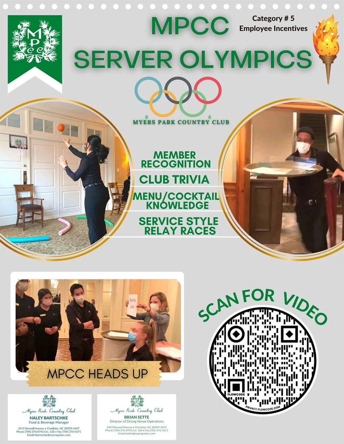 We have been holding the Server Olympic Events for a couple months and have had a great reaction from our team! They look forward to seeing what event we will be having that week and are always asking what management is going to come up with next. We also introduced the Server Olympics to our F&B Board Committee Members and a video will be included in the March MPCC Clubber Newsletter that is sent out to our membership. The membership has seen great improvement in our level of service as we continue to focus on different areas of training through these events. As much as the staff has enjoyed playing the games, the management team has also enjoyed finding new and creative ideas for the staff.