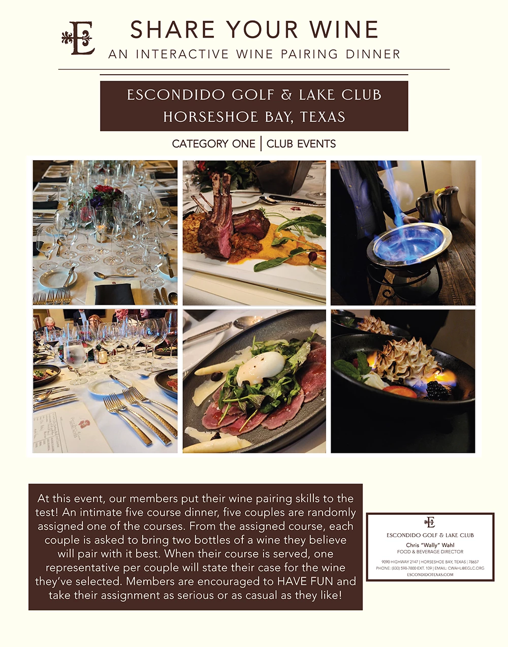 The dinner is fairly easy to put on. We first have the executive chef and his team produce a five-course dinner. We realized any more courses it is either too much wine or too much food. This makes it a dinner for five couples. We advertise the dinner menu with a price and let them know sign up will be in a week. This allows everyone a chance to see it and be ready to sign up. After the dinner is full with ten people, we let everyone else know they are on a wait list. We then take all the courses, place them in a hat, place the members in another hat, and draw a course and then a member. We do this until all courses have a member assigned. We then notify the members of their assigned course. Only the induvial member and we know the wine/course they have. Members love surprising the group with what they bring. We ask of the member a few small things. First is that they bring two bottles of the selected wine to make sure everyone gets a glass. Second when their course is up, they talk about why they brought the wine, why they think it works for the course, and anything personal about the wine or vineyard they love. The only requirement is to bring the wine to us the day before or morning of. We will ensure it gets the proper glass wear, served at the right temperature, and decanted if needed or asked. We provide a small tasting notes page at dinner so they can write down wines they like, flavor profiles they tasted, and what wine was paired perfectly. The dinner menus also have "Course paired by guest sommelier members name" under their corresponding course. Our wine director is there to let the members know of additional choices for pairing, vineyards or regions on the wines they brought. He also provides recommendations on other wines to try based on wine that was poured. We allow about a five-minute window from pouring the wine to serving the course. We want members a chance to speak with no interruptions. Each course introduced is a wow from our talented culinary team. At the end, our members are caught in the most unexpected wine pairing conversations and tales of life. Members love this night. During the dinner they are taking photos, texting pictures, exchanging contact info with one another. The free marketing you get from them telling all other members ensures the next dinner is sold out. After the dinners we see members that never sit together now enjoying after dinner drinks, planning golf trips, and creating a stronger sense of family in the club.