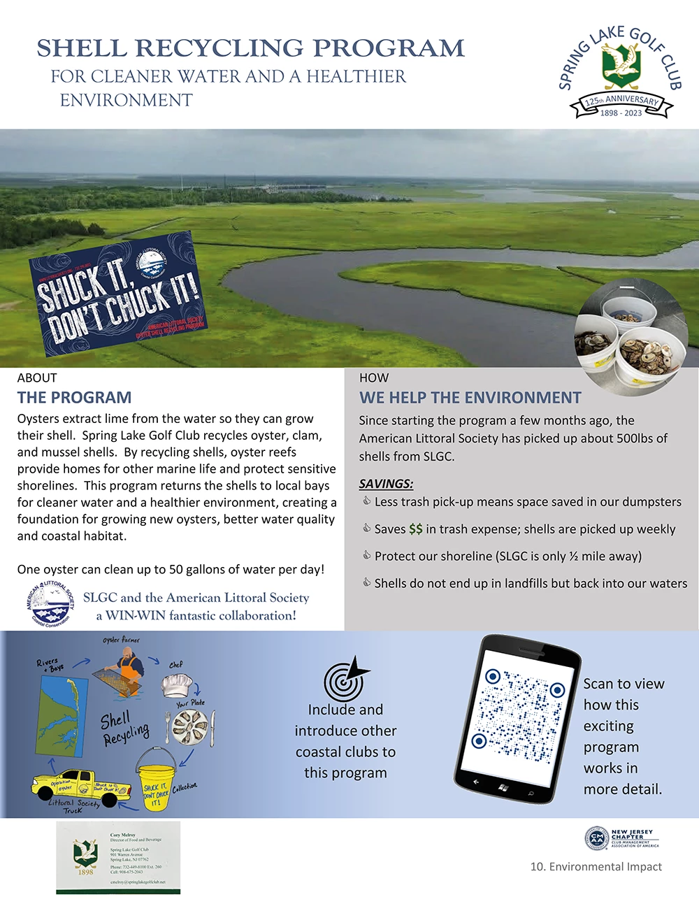 This idea started with the culinary/kitchen staff. We shared video clips and information via email to members and they love this idea of giving back to our coastal habitats. In conjunction with the American Littoral Society in NJ, we partnered with their program and provided about 500 pounds of shells just within the first few months of the program rather than simply tossing these shells into our trash bins. We are introducing this program and spreading the word to other local clubs for a larger impact on our coastal habitats.