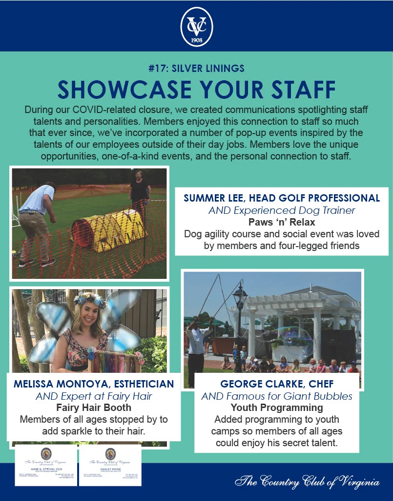For example, Summer Lee, Head Golf Professional, is also an experienced dog trainer. She led a Paws 'n' Relax event for our members that included a dog agility course. One of our Spa estheticians, Melissa, is also an expert at fairy hair, so we created pop-up fairy hair events that attracted members of all ages who wanted to add a little sparkle to their hair. And one of our chefs, George Clarke, is famous for giant bubbles - we incorporated him into our youth camp programming so members of all ages could enjoy this secret talent.