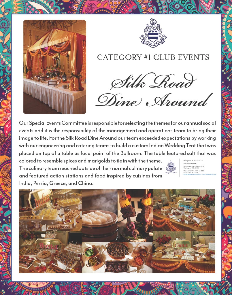 Our members, like many, travel the world and have incredible experience that they wish to recreate at the club. When they bring these ideas to our teams it challenges us to think outside the box and collaborate together to bring their vision to life. For the Silk Road Dine Around our team exceeded expectations by working with engineering and catering to build a custom Indian Wedding Tent that was placed on top of a table as focal point of the ballroom. The table featured salt that was colored to resemble spices and marigolds to tie in with the theme. It is a delicate balance of keeping within budget restraints, determining what is operationally feasible, and ensuring we are exceeding the member's expectations.