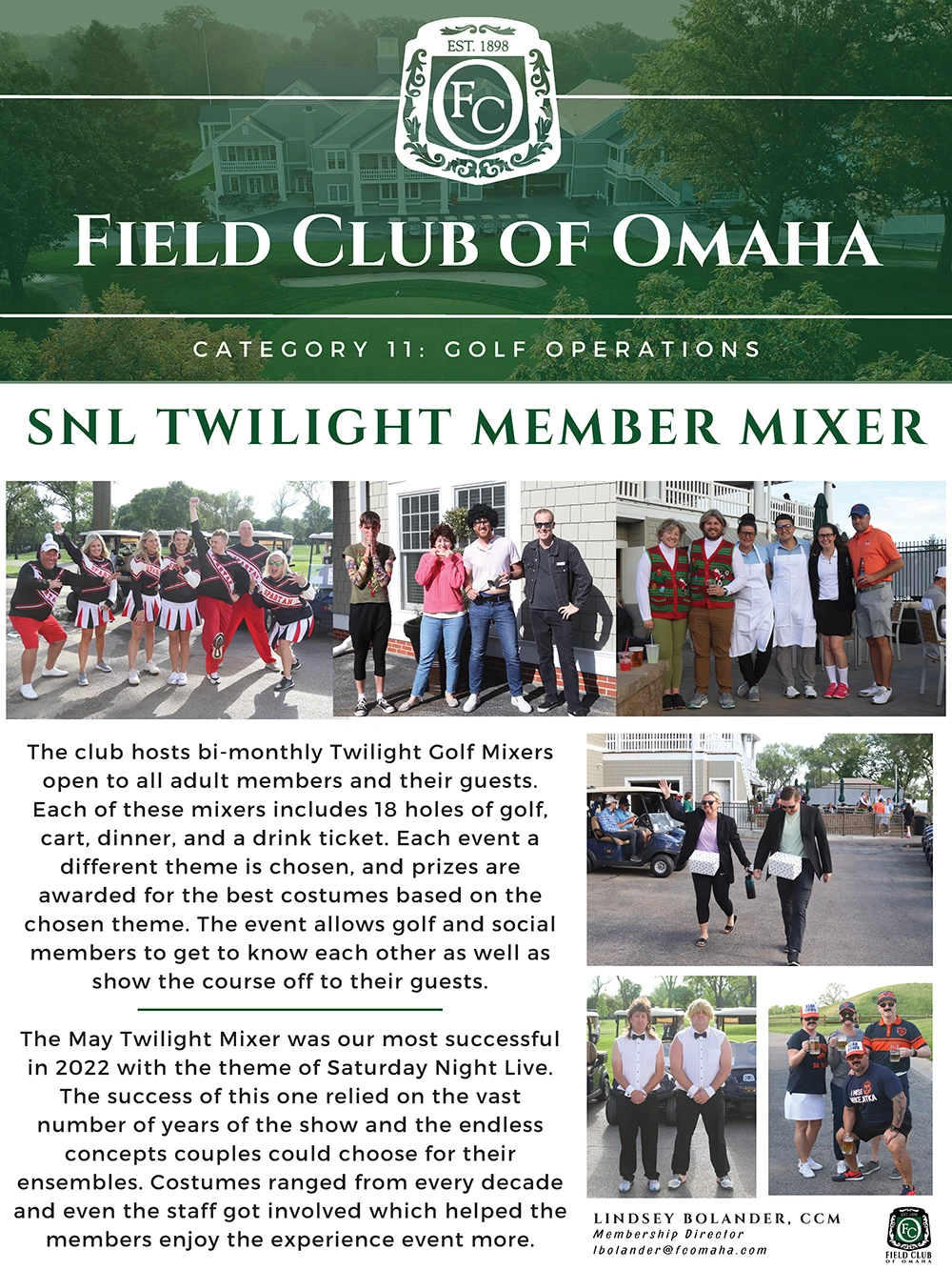 The club hosts bi-monthly Twilight Golf Mixers open to all adult members and their guests. Each of these mixers includes 18 holes of golf, cart, dinner, and a drink ticket. Each event a different theme is chosen, and prizes are awarded for the best costumes based on the chosen theme. The event allows golf and social members to get to know each other as well as show the course off to their guests.