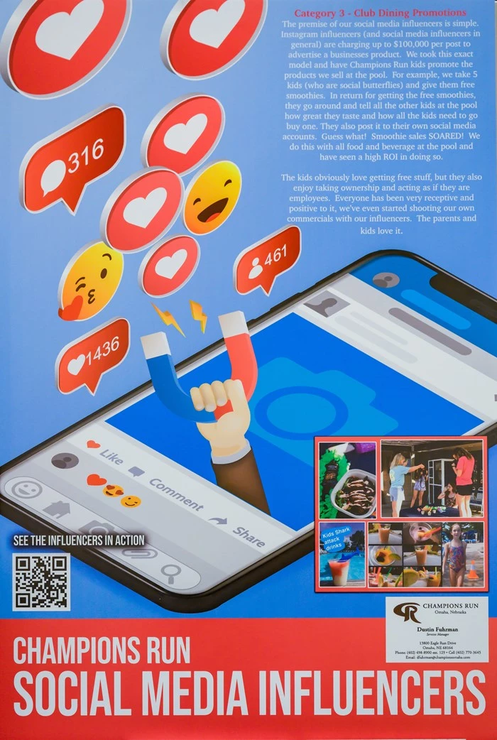 The premise of our social media influencers is simple. Instagram influencers (and social media influencers in general) are charging up to $100,000 per post to advertise a business product. We took this exact model and have Champions Run kids promote the products we sell at the pool. For example, we take 5 kids (who are social butterflies) and give them free smoothies. In return for getting the free smoothies, they go around and tell all the other kids at the pool how great they taste and how all the kids need to go buy one; they also post it to their own social media accounts. Guess what! Smoothie sales SOARED! We do this with all food and beverage at the pool and have seen high ROI in doing so.