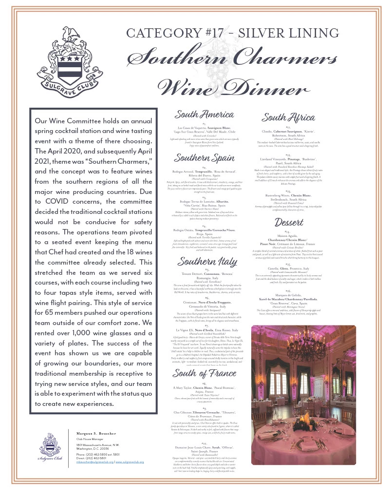 Our Wine Committee holds an annual spring cocktail station and wine tasting event with a theme of there choosing. The April 2020, and subsequently April 2021, theme was “Southern Charmers,” and the concept was to feature wines from the southern regions of all the major wine producing countries. Due to COVID concerns, the committee decided the traditional cocktail stations would not be conducive for safety reasons. After executing a successful multiple plate and ample wine dinner, we have since learned the capabilities of our team and operations. We have learned to think differently in terms of our annual events and find new ways to present and enhance existing events.