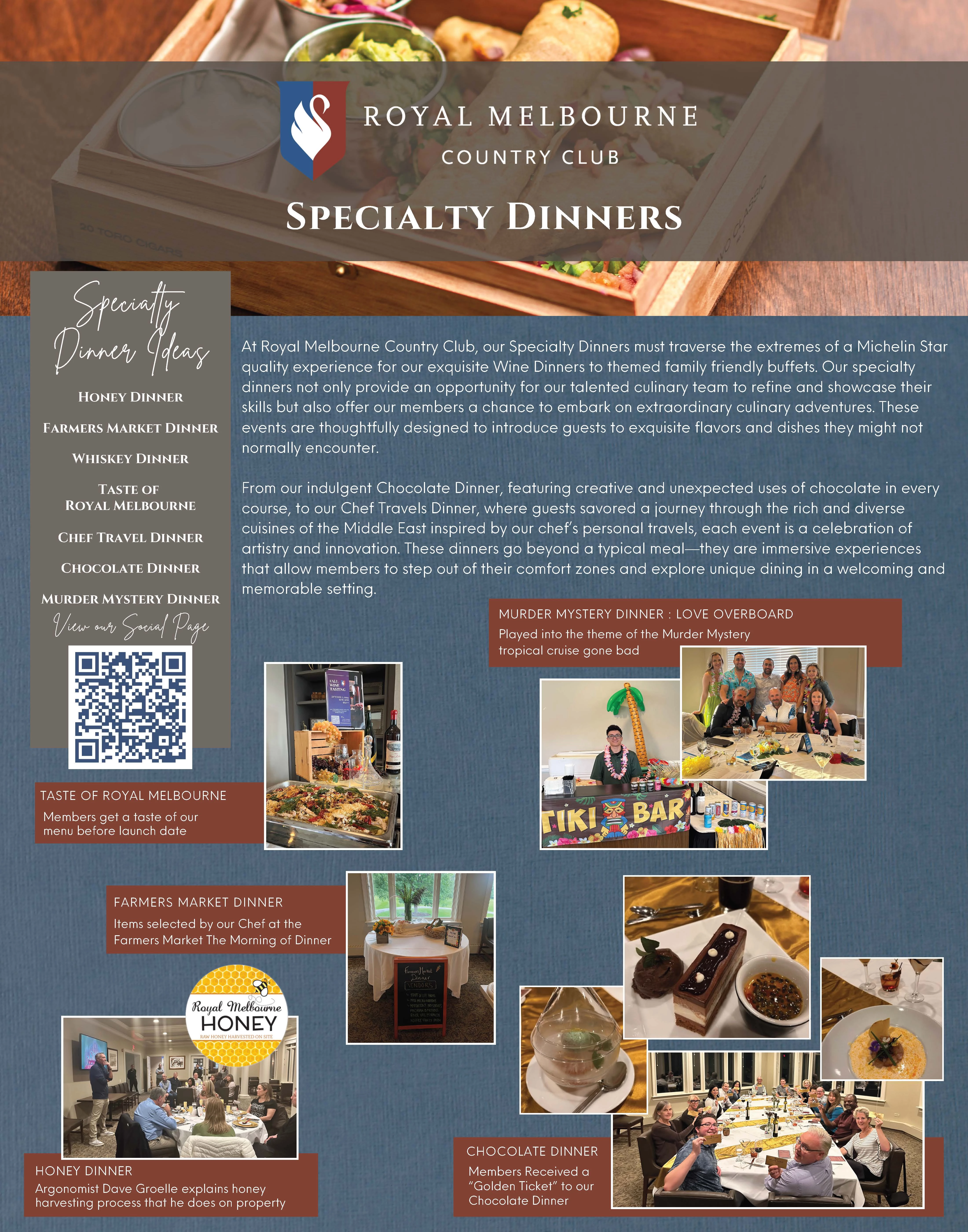 Our Specialty Dinners have significantly enhanced our operations by elevating our dining offerings and creating unique, immersive experiences for our members. These events provide our talented culinary team with opportunities to refine and showcase their skills, pushing the boundaries of creativity and innovation while delivering exceptional quality.