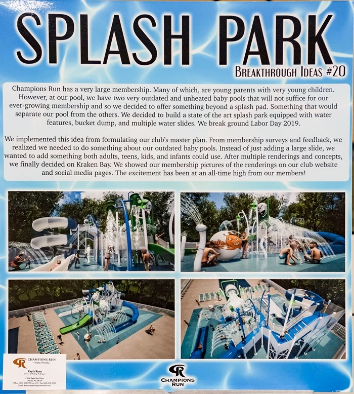 Champions Run has a very large membership. Many of which, are young parents with very young children. However, at our pool, we have two very outdated and unheated baby pools that will not suffice for our ever-growing membership and so we decided to offer something beyond a splash pad. Something that would separate our pool from the others. We decided to build a state of the art splash park equipped with water features, bucket dump, and multiple water slides. We break ground Labor Day 2019.