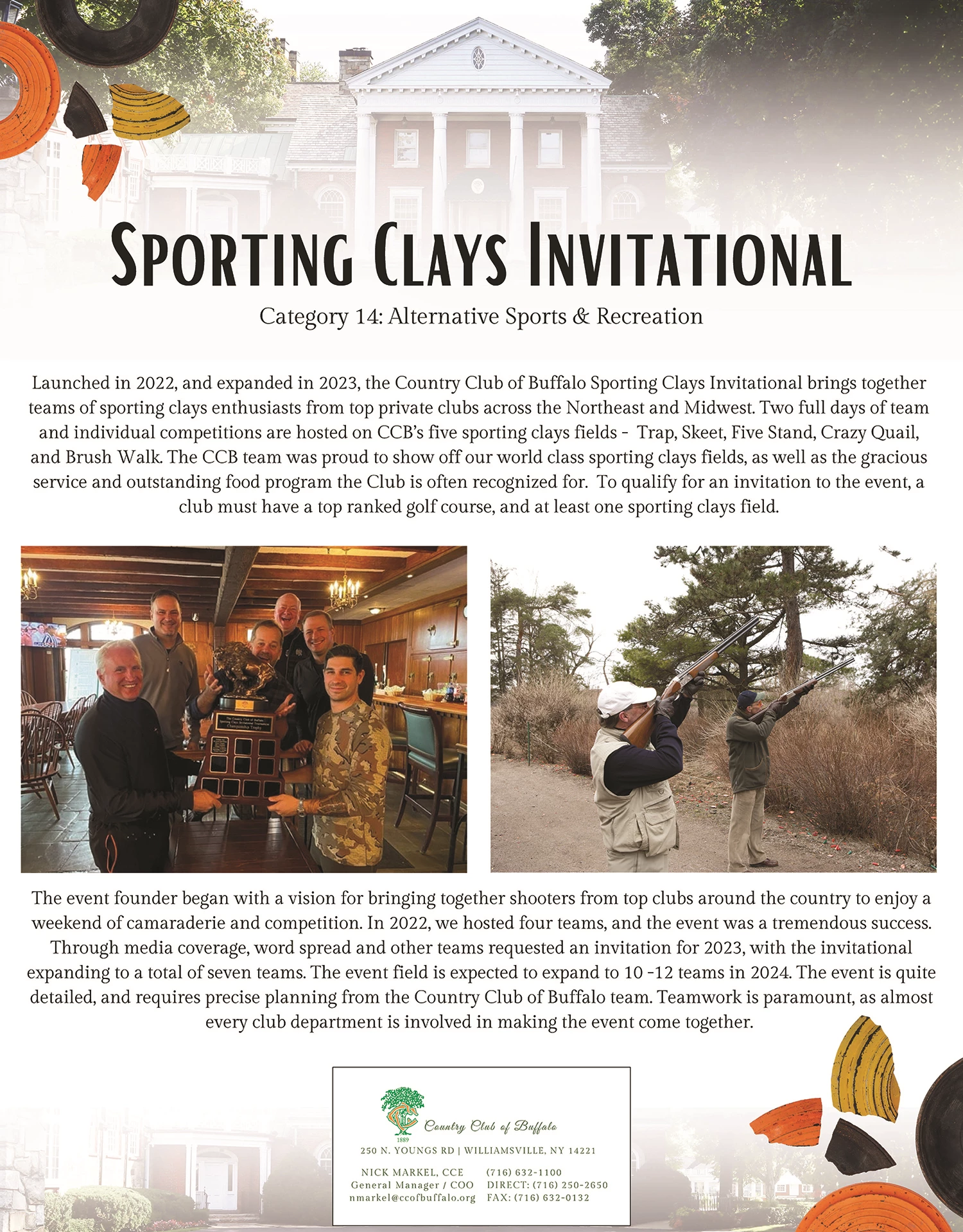 Launched in 2022, and expanded in 2023, The Country Club of Buffalo Sporting Clays Invitational brings together teams of sporting clays enthusiasts from top private clubs across the Northeast and Midwest. Two full days of team and individual competitions are hosted on CCB’s five sporting clays fields - Trap, Skeet, Five Stand, Crazy Quail, and the Brush Walk. This year the team from Medinah Country Club took home the trophy, breaking 762 out of 1,000 total targets, and beating out teams from The Country Club (Brookline), The Country Club (Pepper Pike), Country Club of Rochester, Kirtland Country Club, the Longue Vue Club and CCB. The “Top Gun” individual champion was a member of the Country Club of Buffalo Team.