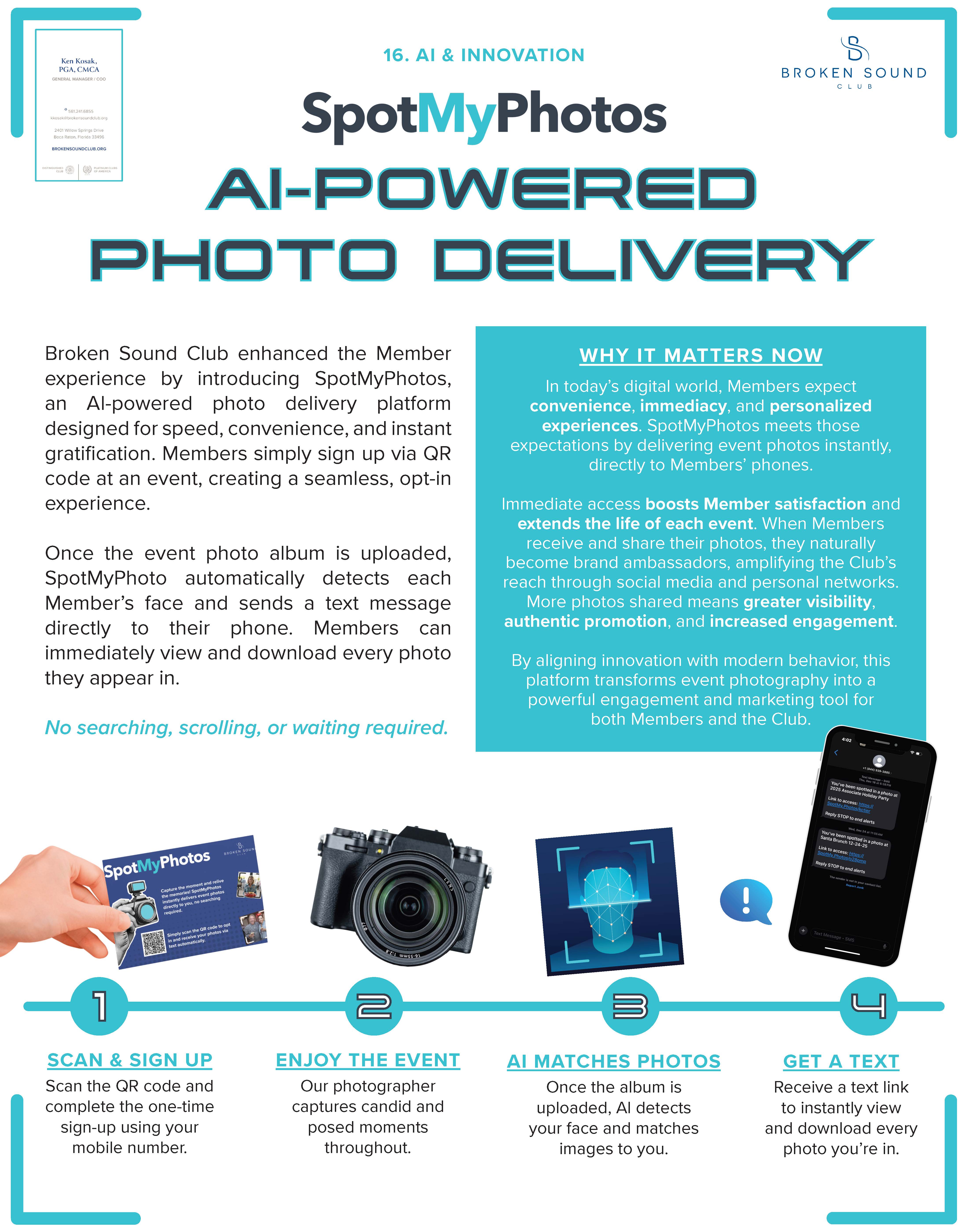 SpotMyPhotos was implemented using a simple QR-code sign-up at events, allowing Members to opt in quickly. Once photos are uploaded, AI matches images and sends Members a personalized text link to instantly view and download their photos.