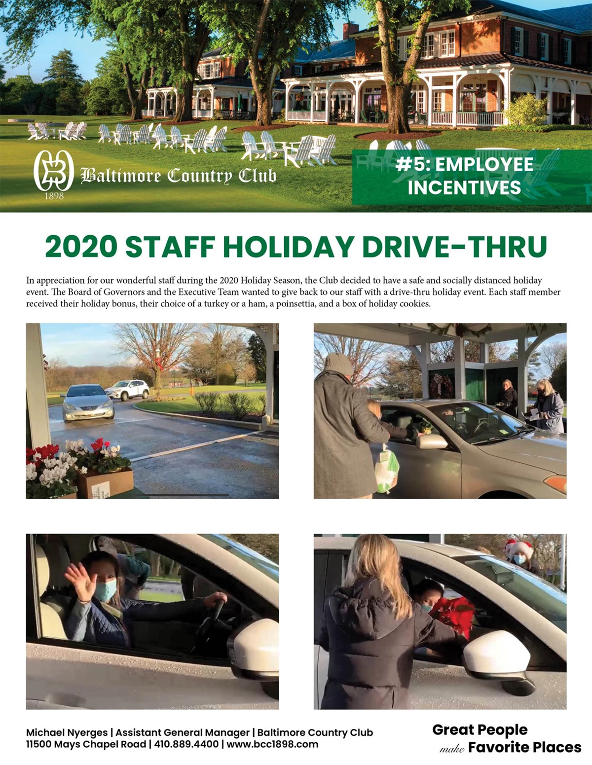 The implementation of the employee holiday drive-by was carefully planned as it included several giveaways including the holiday bonuses. Each employee had a choice of a uncooked turkey or ham; the giveaways consisted of a poinsettias, a box of cookies, gift cards along with their holiday bonus. The club hosted the drive by on a Monday when the club is closed, allowing for all staff and executives to participate in this special holiday event which was much appreciated by all staff members and their families.