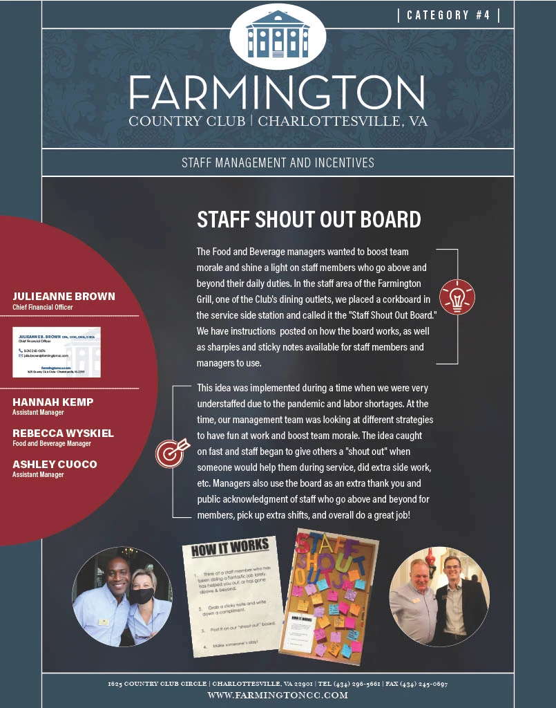 The Food and Beverage managers wanted to boost team morale and shine a light on staff members who go above and beyond their daily duties. In the staff area of the Farmington Grill, one of the Club's dining outlets, we placed a corkboard in the service side station and called it the "Staff Shout Out Board." We have instructions posted on how the board works, as well as sharpies and sticky notes available for staff members and managers to use.