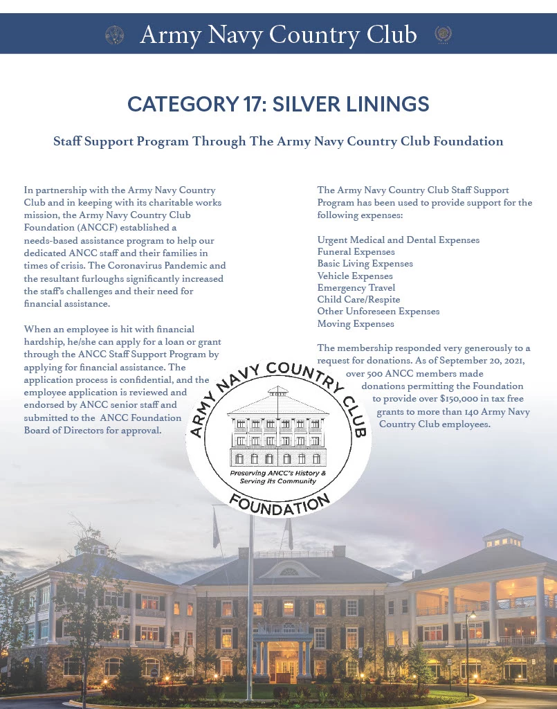 In partnership with the Army Navy Country Club and in keeping with its charitable works mission, the Army Navy Country Club Foundation (ANCCF) established a needs-based assistance program to help our dedicated ANCC staff and their families in times of crisis. The membership responded very generously to a request for donations. As of September 20, 2021, over 500 ANCC members made donations permitting the Foundation to provide over $150,000 in tax free grants to more than 140 Army Navy Country Club employees.