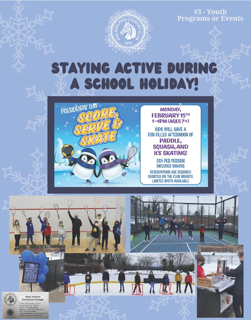 Last winter during COVID, we were still looking to keep our Junior Members engaged during an especially challenging time for children. We created a new (mostly outdoor) event that could keep them active while school was closed on President's Day. The Score, Serve & Skate was held in the afternoon and allowed kids to come out to play Squash, Paddle Tennis and Ice Skate at the Club.