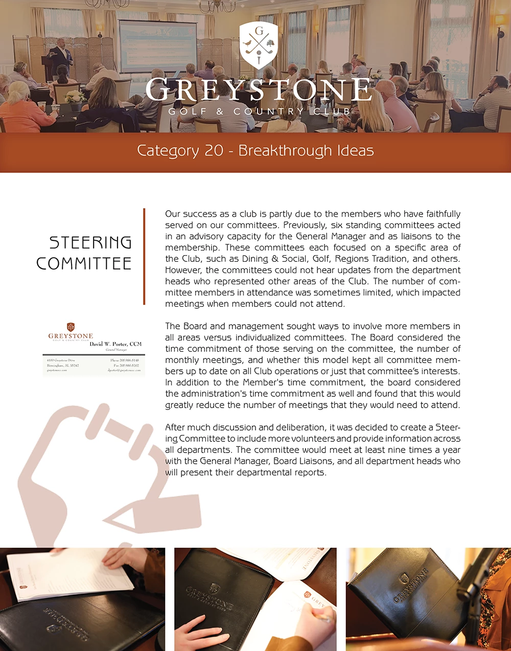 Board and management sought ways to involve more members in all areas versus individualized committees. The Board considered the time commitment of those serving on the committee, the number of monthly meetings, and whether this model kept all committee members up to date on all Club operations or just that committee’s interests. In addition to the Member's time commitment, the board considered the administration's time commitment as well and found that this would greatly reduce the number of meetings that they would need to attend. This change resulted in the General Manager and Director of Administration having 36 meetings less per year.