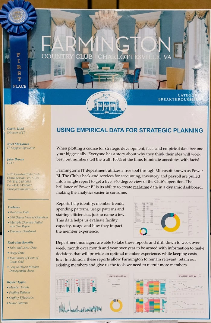 Farmington's IT department utilizes a free tool through Microsoft known as Power BI. The Club's back-end services for accounting, inventory and payroll are pulled into a single report to get a live, 360 degree view of the Club's operation. The brilliance of Power BI is its ability to create real-time data in a dynamic dashboard, making the analytics easier to consume.