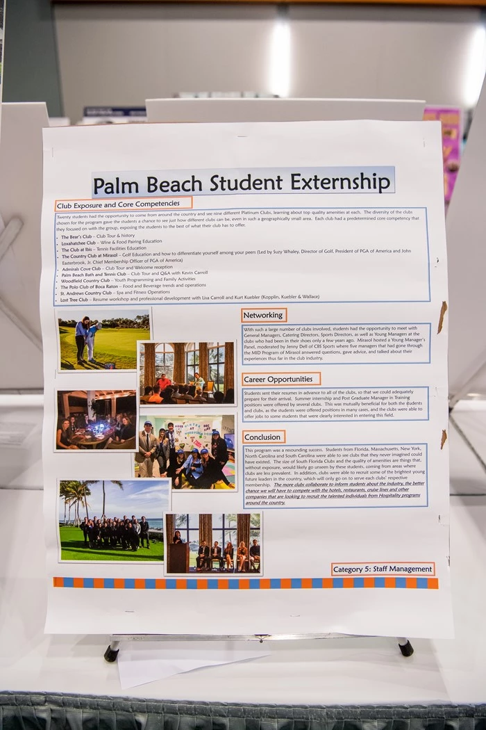 The Palm Beach Club Externship is an educational, week long program designed for students interested in entering the club industry after graduation. Primarily consisting of CMAA student members, a group of 15-20 students from several universities apply to attend this program. The students get a chance to tour eight different Platinum clubs, and learn about the different core competencies at each club. Throughout the week, they not only have the opportunity to network with each other, but also with club managers at each property. This program is mutually beneficial to both clubs and students, as it gives students the chance to expand their network and knowledge of private clubs, while the clubs get a chance to meet and recruit students from CMAA chapters from around the country. This will continue to enhance the quality of staff and ultimately managers at these clubs, as we help prepare students for their future as leaders in the industry.