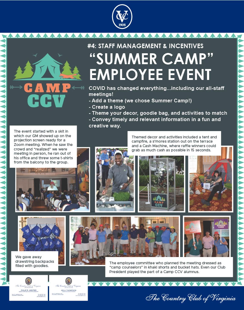 For our first post-pandemic all-staff meeting in June, we utilized a Summer Camp theme. We started with a funny skit in which our GM showed up on the projection screen ready for a Zoom meeting. When he saw the crowd and “realized” we were meeting in person, he ran out of his office, threw some tee shirts from the balcony to the group, and then ran downstairs to join us in person. Our Club President played the part of a Camp CCV alumnus, and each of our department directors was a counselor.