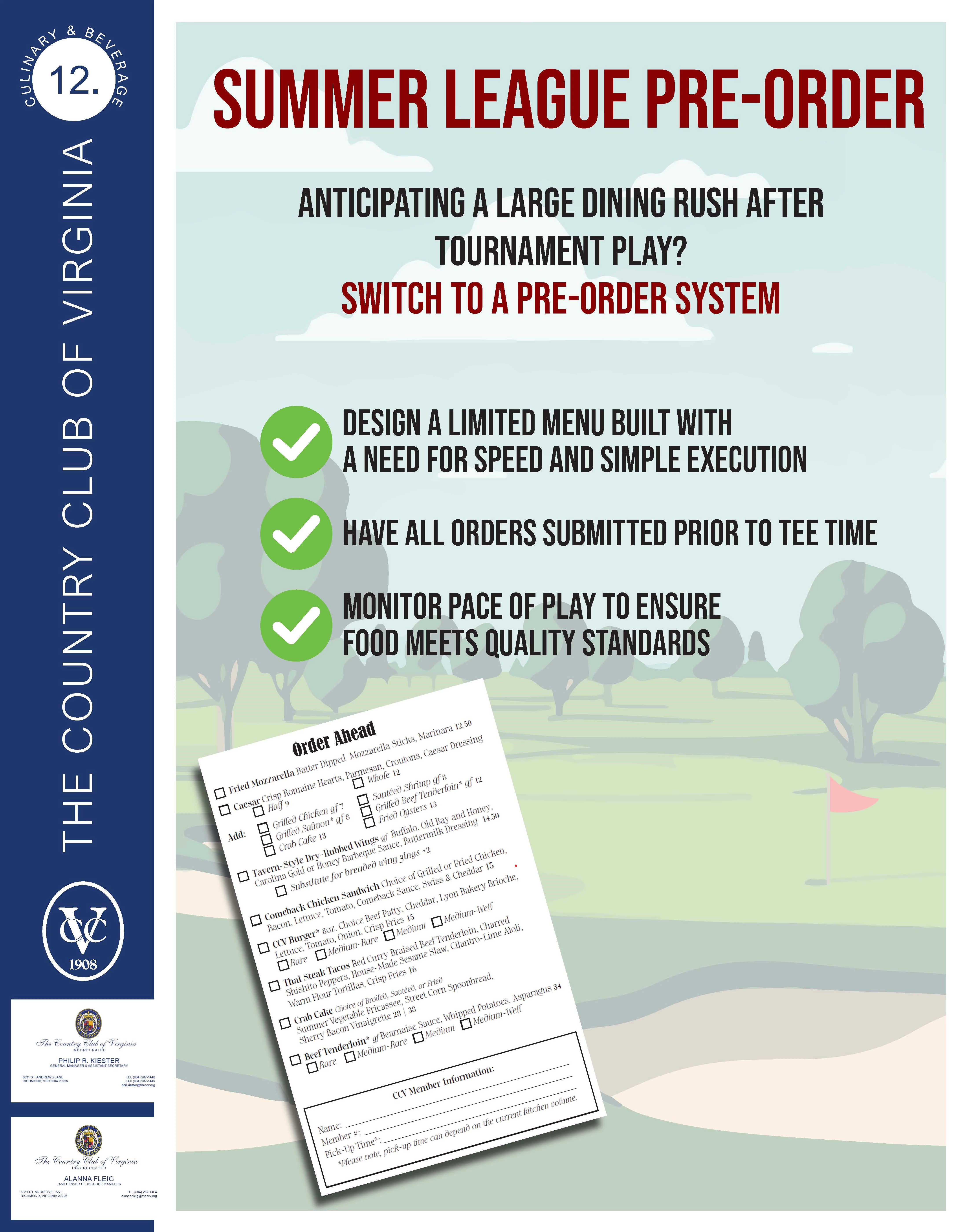 On Wednesday and Thursdays, our Golf Summer League flocks to The Grill when they finish playing. This led to the kitchen getting bombarded with 80+ orders, 10 minutes before closing, all rang in at the same time. To solve this, Chef made a simplified, speed-of-service focused, limited menu. An order form was handed out to all of the players prior to their tee time, the forms were returned to a golf pro, and then the golf pro brought the order sheets to The Grill. As play continued, the golf pro staff kept F&B updated on pace of play, so the kitchen knew when to fire the orders in mass.