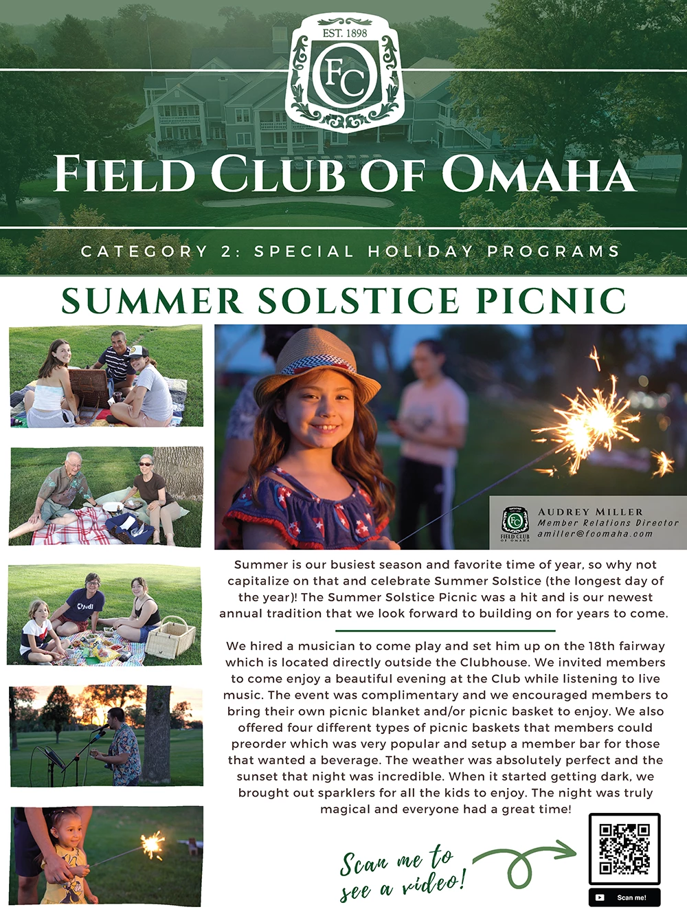 We hired a musician to come play and set him up on the 18th fairway which is located directly outside the Clubhouse. We invited members to come enjoy a beautiful evening at the Club while listening to live music. The event was complimentary and we encouraged members to bring their own picnic blanket and/or picnic basket to enjoy. We also offered four different types of picnic baskets that members could preorder which was very popular and setup a member bar for those that wanted a beverage. The weather was absolutely perfect and the sunset that night was incredible. When it started getting dark, we brought out sparklers for all the kids to enjoy. The night was truly magical and everyone had a great time!