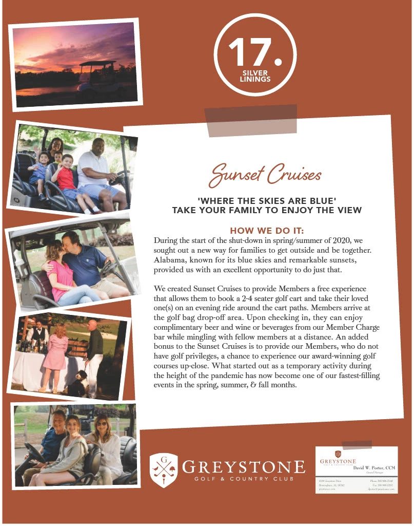 Members take a sunset cruise around the golf cart path while enjoying complimentary beer and wine or a beverage from the bar. This allowed members to get out during the height of covid and spend time with family. They were also able to socially distance and visit with friends. This idea improved the member experience and engaged our membership during the shutdown when they could not enter the clubhouse or dine in our restaurants.