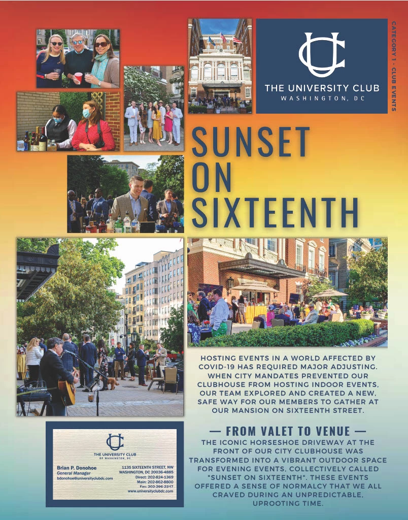 The idea was implemented by the team adjusting to the external factors of city wide mandates and programming member events in a space that was never used as an event space before, the iconic horseshoe driveway on 16th street. The members were thrilled about the idea and attended the Sunset on 16th events with great enthusiasm and numbers. The Sunset on 16th series will continue even as we come out of COVID as they were so well received. Everyone that drove or walked by was able to see what The University Club of Washington D.C. was doing for its members!