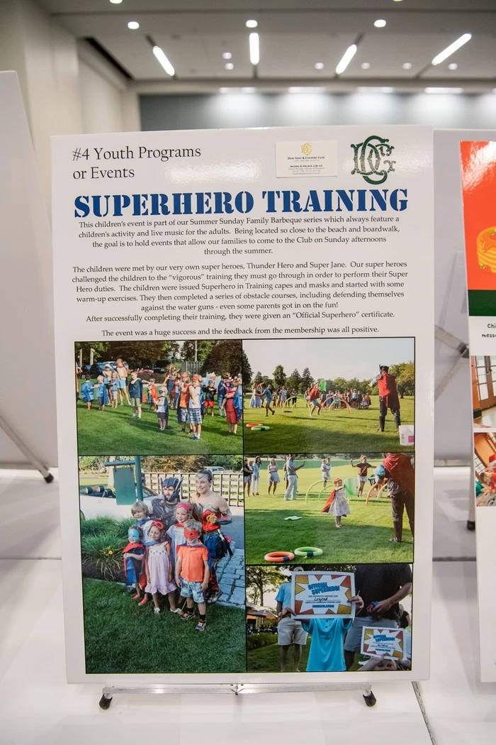 We featured Superhero Training during one of our Sunday Family Barbeque events. Two superheroes greeted the children, "issued" them capes and masks and invited them to participate in training to become a superhero They began with warm-up exercises then ran through an obstacle course, which featured a water gun shoot out. Our Sunday Family Barbeque series was implemented as a way to bring families to the Club, not just parents and children, but grandparents with their grandchildren.