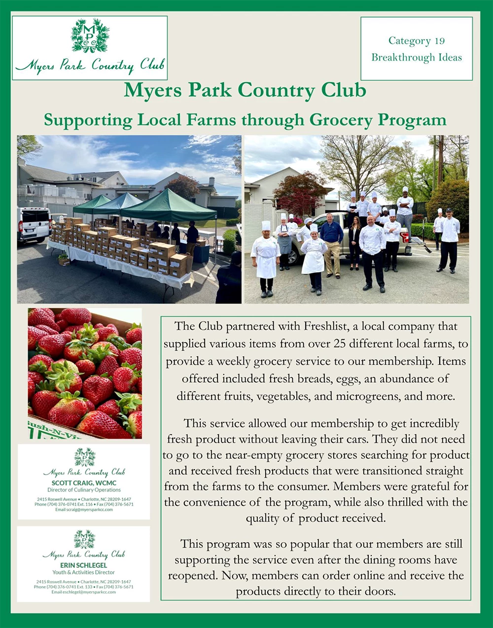 This service allowed our membership to get incredibly fresh product without leaving their cars. They did not need to go to the near-empty grocery stores searching for product and received fresh products that were transitioned straight from the farms to the consumer. Members were grateful for the convenience of the program, while also thrilled with the quality of product received. This program was so popular that our members are still supporting the service even after the dining rooms have reopened. Now, members can order online and receive the products directly to their doors.