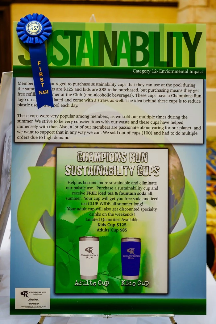 Members are encouraged to purchase sustainability cups that they can use at the pool during the summer. Adults are $125 and kids are $85 to be purchased, but purchasing means they get free refills all summer at the pool cafe (non-alcoholic beverages). These cups have a Champions Run logo on it, are insulated and come with a straw, as well. The idea behind these cups is to reduce plastic use at the pool each day.