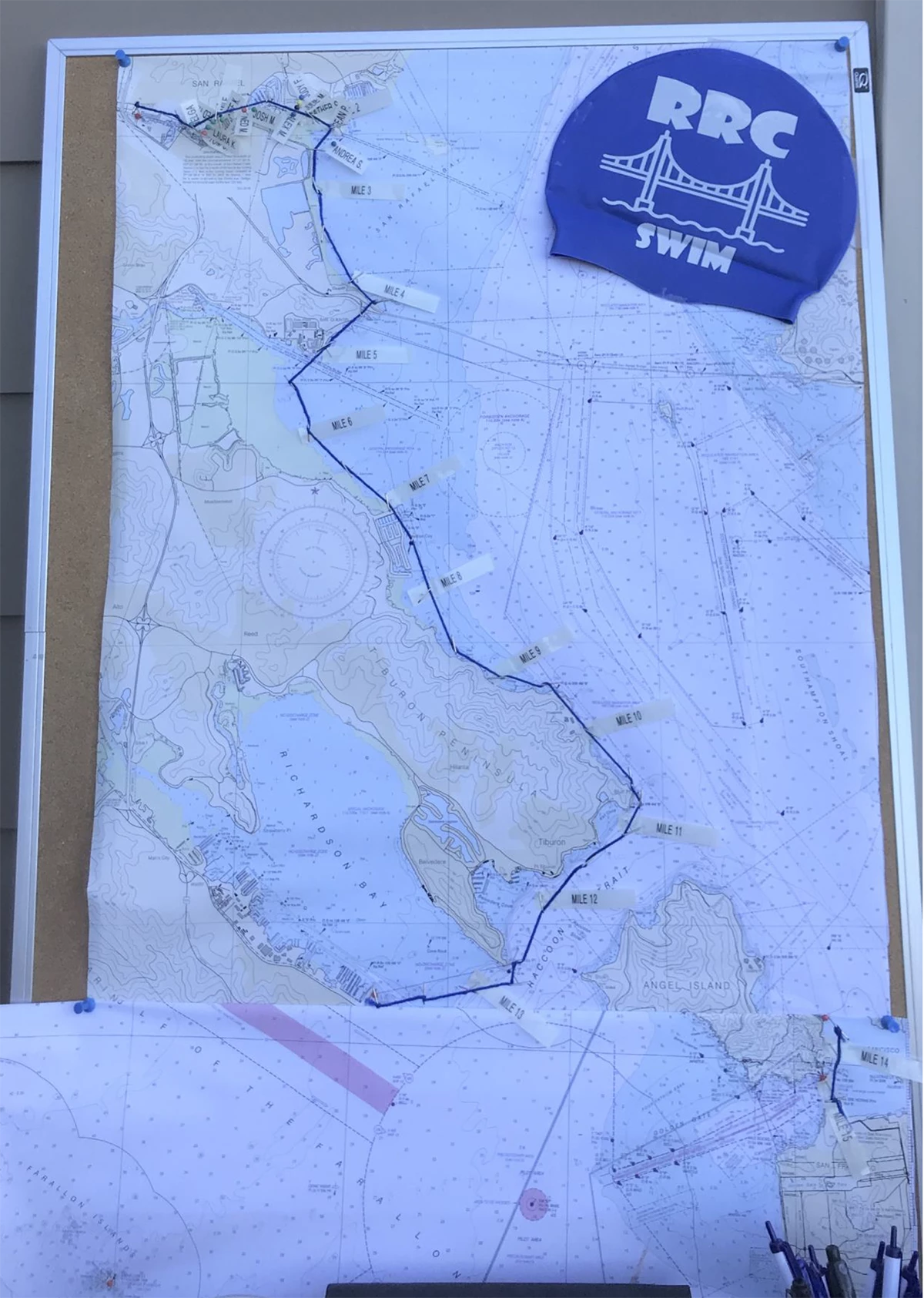 Because we couldn't hold our annual Holiday Party this December, we decided to launch Membership Appreciation month (why hadn't we done this before?!). Among many other activities designed to bring people to the Club in a safe and distanced way, our Aquatics Director set up a "Swim to the Bridge" contest. Located on the San Francisco Bay, our town was perfectly located to offer swimmers a virtual race from San Rafael to the Golden Gate Bridge. We mapped out a course through the local canal, out into the choppy waters of the San Francisco Bay, past Angel Island and out to the Pacific Ocean. The total course was 15.1 miles. Those seeking glory continued past the bridge en route to the Farallon Islands (in our case, not teeming with Great White Sharks).