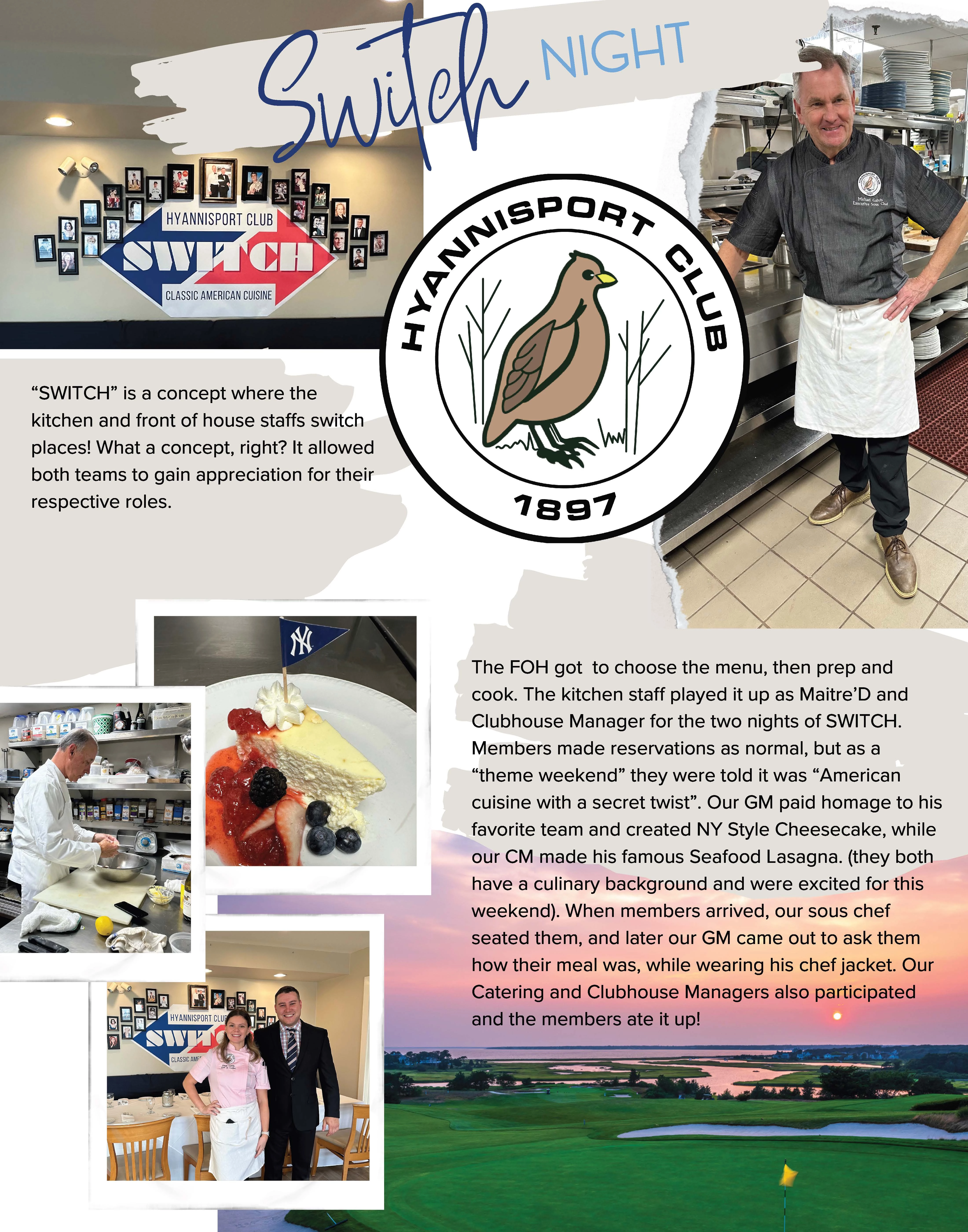 The FOH got to choose the menu, then prep and cook. The kitchen staff played it up as Maitre’D and Clubhouse Manager for the two nights of SWITCH. Members made reservations as normal, but as a “theme weekend” they were told it was “American cuisine with a secret twist”. Our GM paid homage to his favorite team and created NY Style Cheesecake, while our CM made his famous Seafood Lasagna. (they both have a culinary background and were excited for this weekend). When members arrived, our sous chef seated them, and later our GM came out to ask them how their meal was, while wearing his chef jacket. Our Catering and Clubhouse Managers also participated and the members ate it up!
