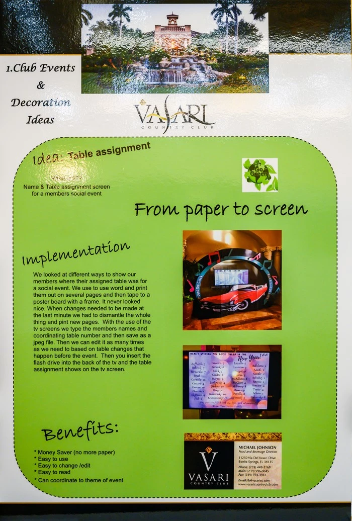 We looked at different ways to show our members where their assigned table was for a social event. We use to use word and print them out on several pages and then tape to a poster board with a frame. It never looked nice. When changes needed to be made at the last minute we had to dismantle the whole thing and pint new pages. With the use of the tv screens we type the members names and coordinating table number and then save as a jpeg file. Then we can edit it as many times as we need to based on table changes that happen before the event. Then you insert the flash drive into the back of the tv and the table assignment shows on the tv screen. Our members feel its easy to read, fun as we can make it go with the theme of the party!