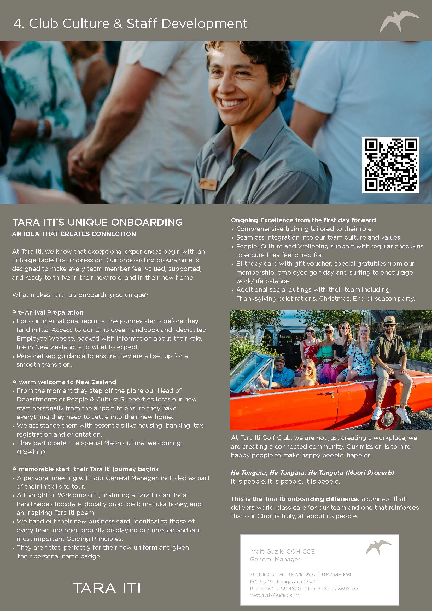Our unique onboarding approach has been implemented through a thoughtful and comprehensive programme that includes personalised pre-arrival support, a warm welcome at the airport, and integration into our country and club's culture, as well as a thorough orientation process, tailored training and a traditional Pōwhiri (Maori welcome ceremony). All new staff receive a personal introduction to the club's history and values from our General Manager, Matt Guzik, as well as welcome gift, ongoing mentorship, access to People and Culture support and feedback sessions.