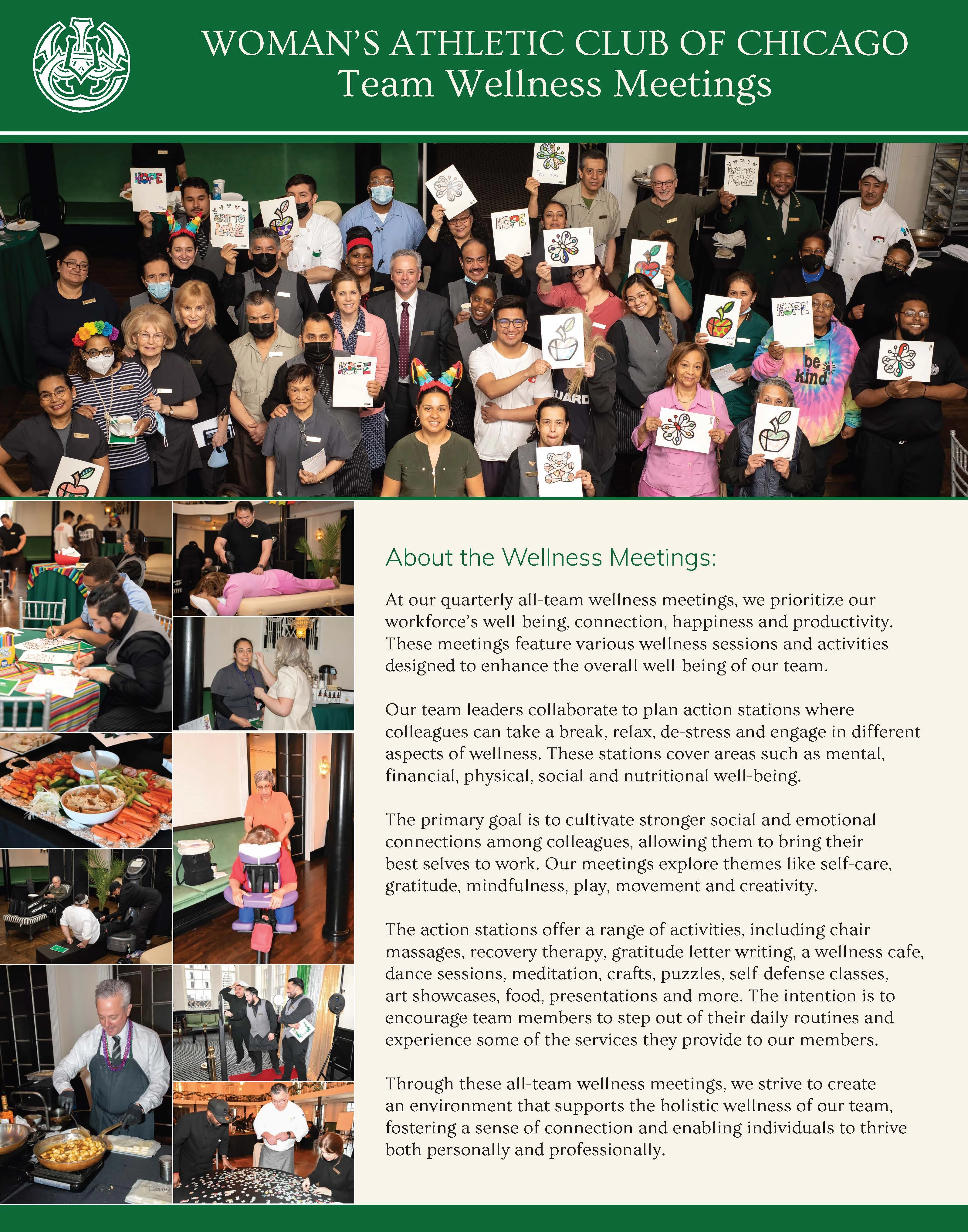 The idea is to have a quarterly all-team wellness meeting where we prioritize our workforce's well-being, connection, happiness and productivity. These meetings feature various wellness sessions and activities designed to enhance the overall well-being of our team. Our team walks out feeling rejuvenated, cherished and motivated.